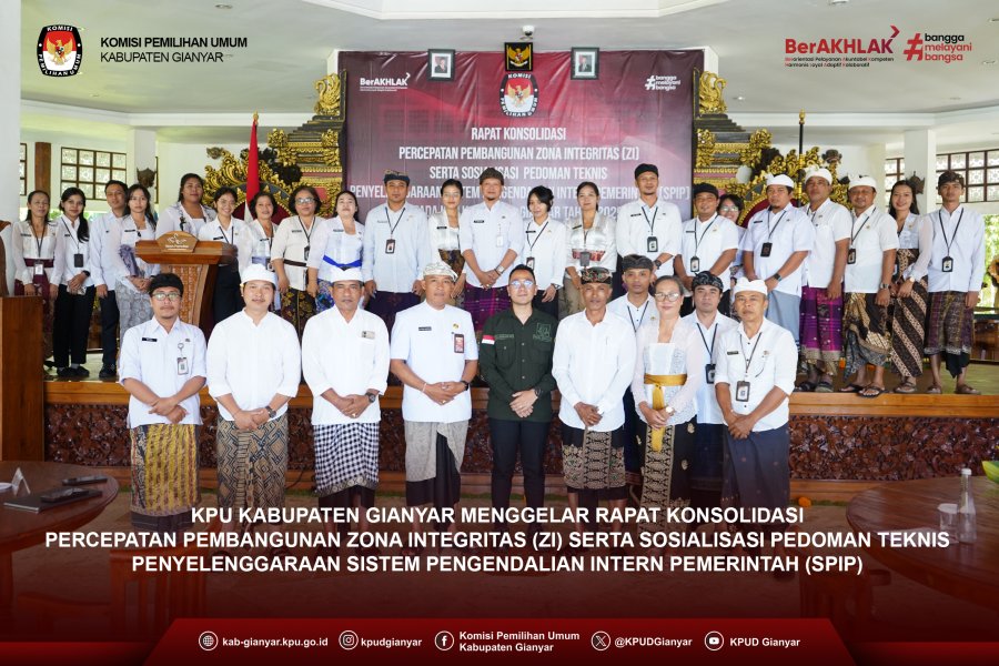 Dalam rangka percepatan pembangunan Zona Integritas (ZI) menuju Wilayah Bebas dari Korupsi (WBK) dan Wilayah Birokrasi Bersih dan Melayani (WBBM), KPU Kabupaten Gianyar menggelar Rapat Konsolidasi Percepatan Pembangunan Zona Integritas (ZI) serta Sosialisasi Pedoman Teknis Penyelenggaraan Sistem Pengendalian Intern Pemerintah (SPIP), Kamis (4/12/2025).