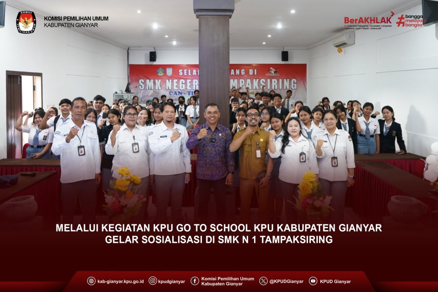 Melalui kegiatan ”KPU Go To School” KPU Kabupaten Gianyar kembali mendatangi SMK N 1 Tampaksiring guna memberikan sosialisasi Pendidikan pemilih kepada pemilih pemula pada Senin, 9 Maret 2026.