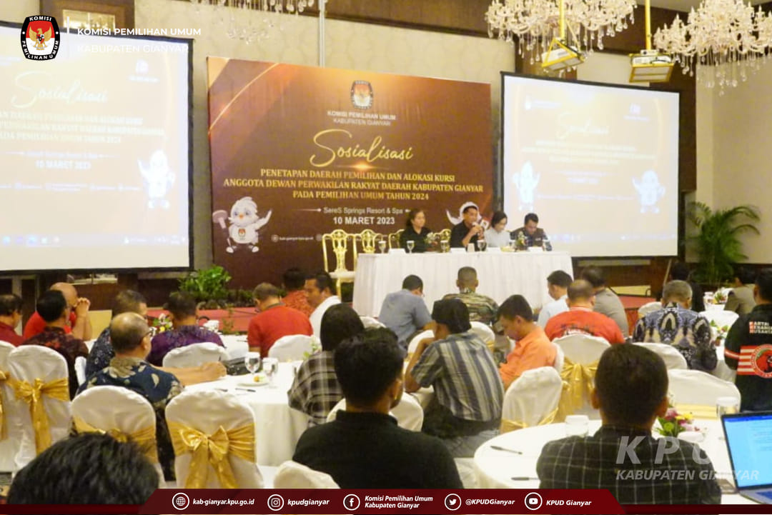 Gianyar, kab-gianyar.kpu.go.id - #TemanPemilih Komisi Pemilihan Umum Kabupaten Gianyar menggelar Sosialisasi Penetapan Daerah Pemilihan dan Alokasi Kursi Anggota Dewan Perwakilan Rakyat Daerah Kabupaten Gianyar pada Pemilu tahun 2024 yang bertempat di SereS Resort & Spa, Ubud. Kegiatan yang diselenggarakan pada Jum'at (10/3/2023) mengundang instansi terkait Pemerintah Kabupaten Gianyar, Forkopimda, Camat dan Panitia Pemilihan Kecamatan (PPK) se-kabupaten Gianyar