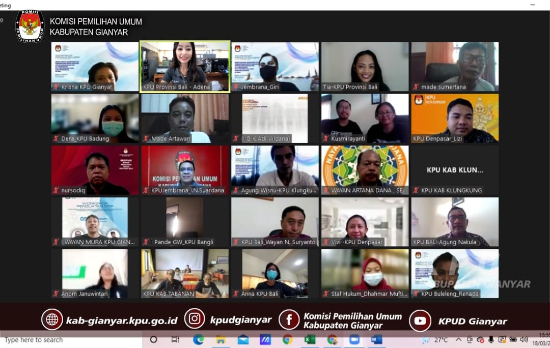 Komisi Pemilihan Umum (KPU) Kabupaten Gianyar yaitu I Wayan Mura selaku divisi Hukum dan Pengawasan bersama Kasubbag Hukum dan SDM pada hari Jumat (18/3/2022) mengikuti rapat koordinasi yang diselenggarakan oleh KPU Provinsi Bali secara daring. Rapat Koordinasi membahas Persiapan Pelaksanaan Program dan Kegiatan Hukum di Lingkungan KPU se-Bali yang dihadiri oleh komisioner divisi Hukum dan Pengawasan bersama Kasubag Hukum dan SDM KPU Kabupaten/Kota se-Bali.