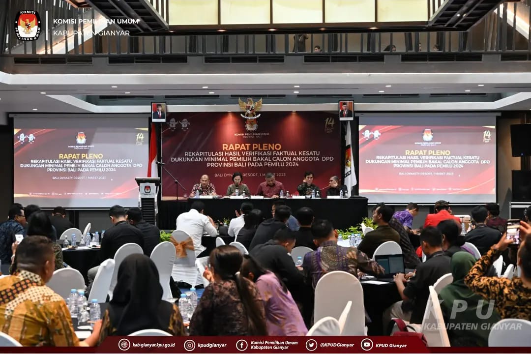 KPU GIANYAR HADIRI RAPAT PLENO REKAPITULASI VERIFIKASI FAKTUAL KESATU DUKUNGAN MINIMAL BAKAL CALON ANGGOTA DPD PROVINSI BALI PADA PEMILU 2024