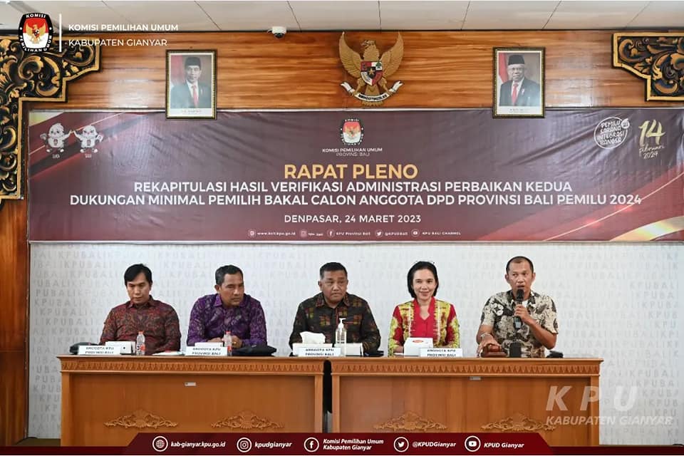 KPU KABUPATEN GIANYAR HADIRI RAPAT PLENO HASIL REKAPITULASI HASIL VERIFIKASI ADMINISTRASI PERBAIKAN KEDUA DUKUNGAN MINIMAL PEMILIH BAKAL CALON ANGGOTA DPD PROVINSI BALI PEMILU 2024