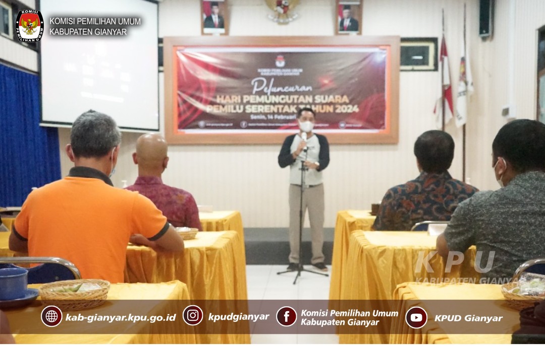 Senin (14/2/2022), Komisi Pemilihan Umum Kabupaten Gianyar menggelar acara Nonton Bareng Peluncuran hari Pemungutan Suara Pemilu Serentak Tahun 2024. Bertempat di ruang rapat kantor KPU Kabupaten Gianyar, kegiatan ini dihadiri tentunya oleh jajaran komisioner dan sekretariat KPU Kabupaten Gianyar serta menghadirkan tamu undangan dari berbagai stakeholder diantaranya Perwakilan dari DPRD Kabupaten Gianyar, Polres Gianyar, Dandim 1616 Gianyar, Kejaksaan Negeri Kabupaten Gianyar, Kepala Badan Kesbangpol Kabupaten Gianyar, Bawaslu Kabupaten Gianyar, dan pimpinan/pengurus partai politik se-Kabupaten Gianyar.