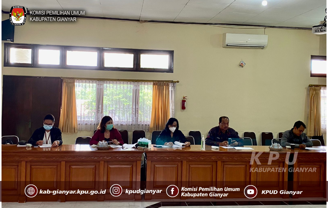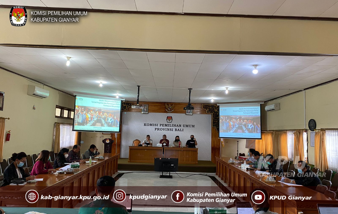 KPU Kabupaten Gianyar, Selasa (08/03/2022) mengikuti rapat yang dilaksanakan oleh KPU Propinsi Bali, tentang pembahasan draf PKPU partisipasi masyarakat dalam penyelenggaraan pemilihan umum dan pemilihan di ruang rapat kantor KPU Bali yang dihadiri oleh anggota KPU Gianyar divisi Sosdiklih, Parmas dan SDM, I Komang Endra Gunawan dan diikuti juga oleh Komisioner Divisi Parmas KPU Kab/Kota se-Bali.