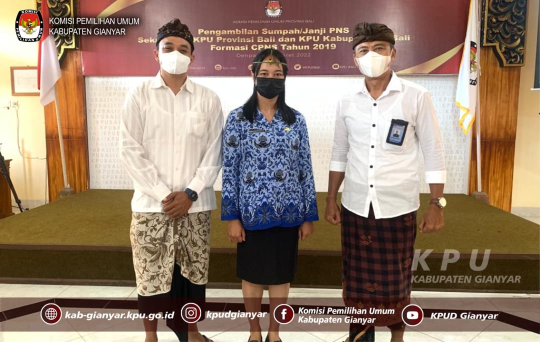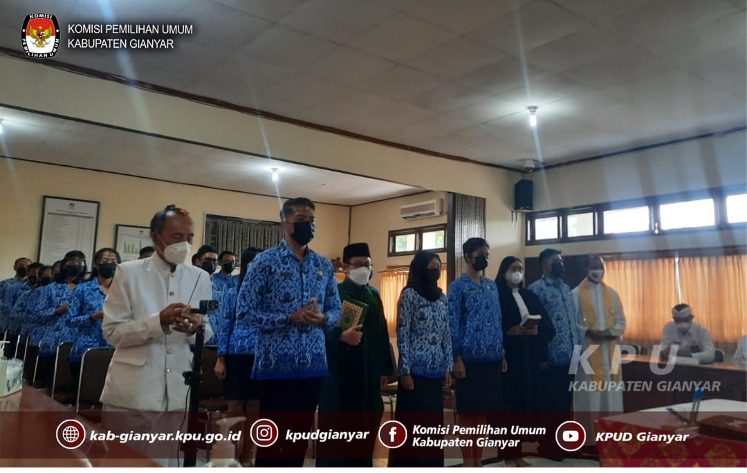 KPU Kabupaten Gianyar mengikuti acara Pengambilan Sumpah/Janji PNS Sekretariat KPU Provinsi Bali dan KPU Kabupaten Formasi CPNS tahun 2019 yang bertempat di KPU Provinsi Bali pada Kamis (10/3) yang dilaksanakan secara daring dan luring.