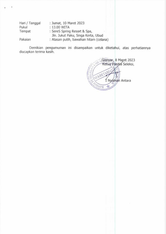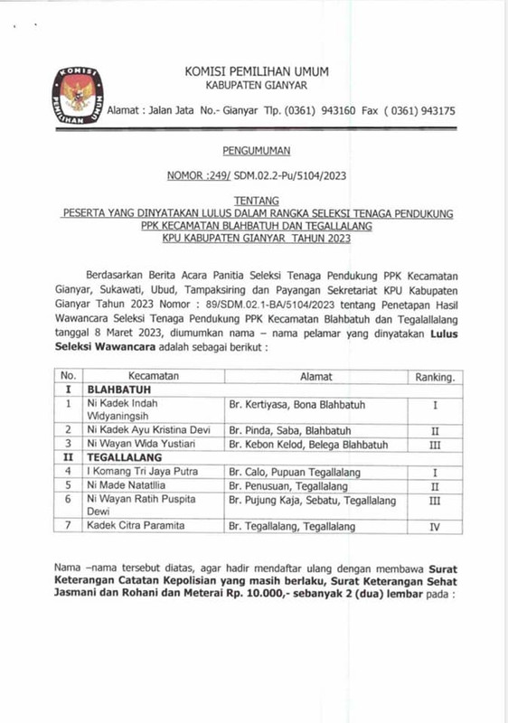 PENGUMUMAN HASIL SELEKSI WAWANCARA TENAGA PENDUKUNG PPK BLAHBATUH DAN TEGALLALANG