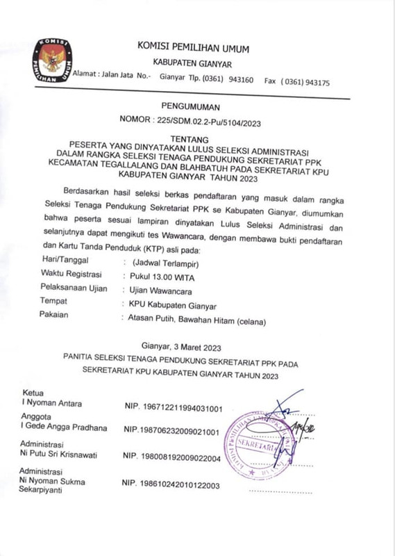 Berikut kami umumkan peserta yang dinyatakan lulus seleksi administrasi dalam rangka seleksi tenaga pendukung PPK Kecamatan Tegallalang dan Blahbatuh pada Sekretariat KPU Kabupaten Gianyar.