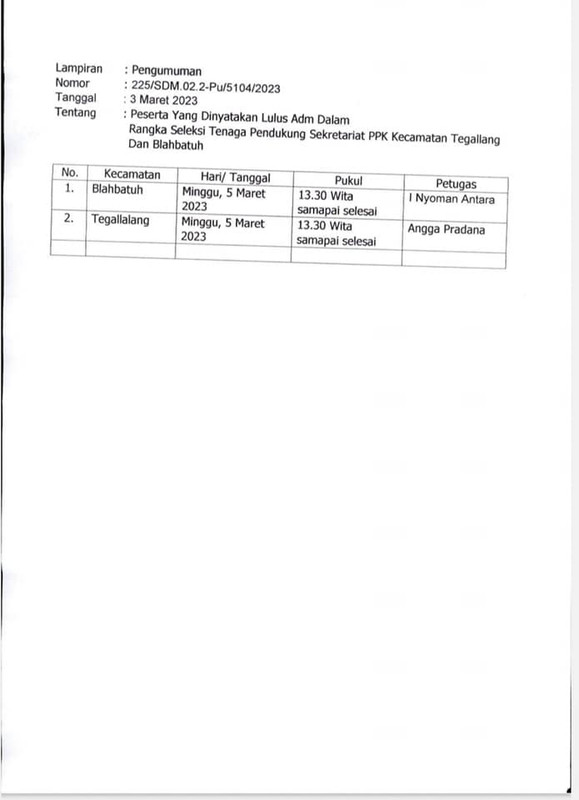 PENGUMUMAN PESERTA LULUS SELEKSI ADMINISTRASI SELEKSI TENAGA PENDUKUNG PPK KECAMATAN TEGALALANG DAN BLAHBATUH