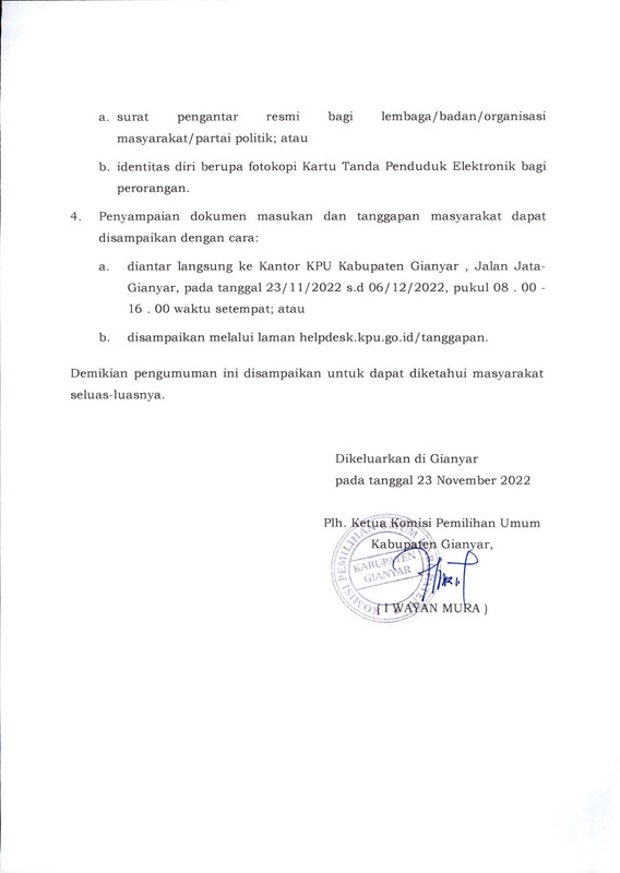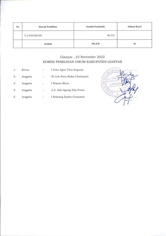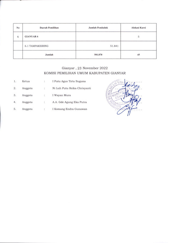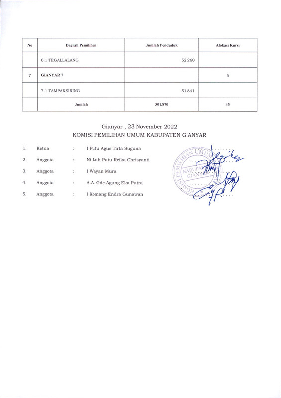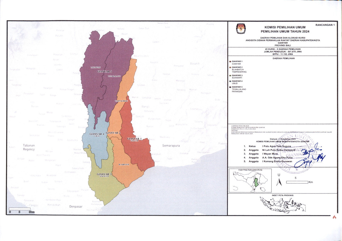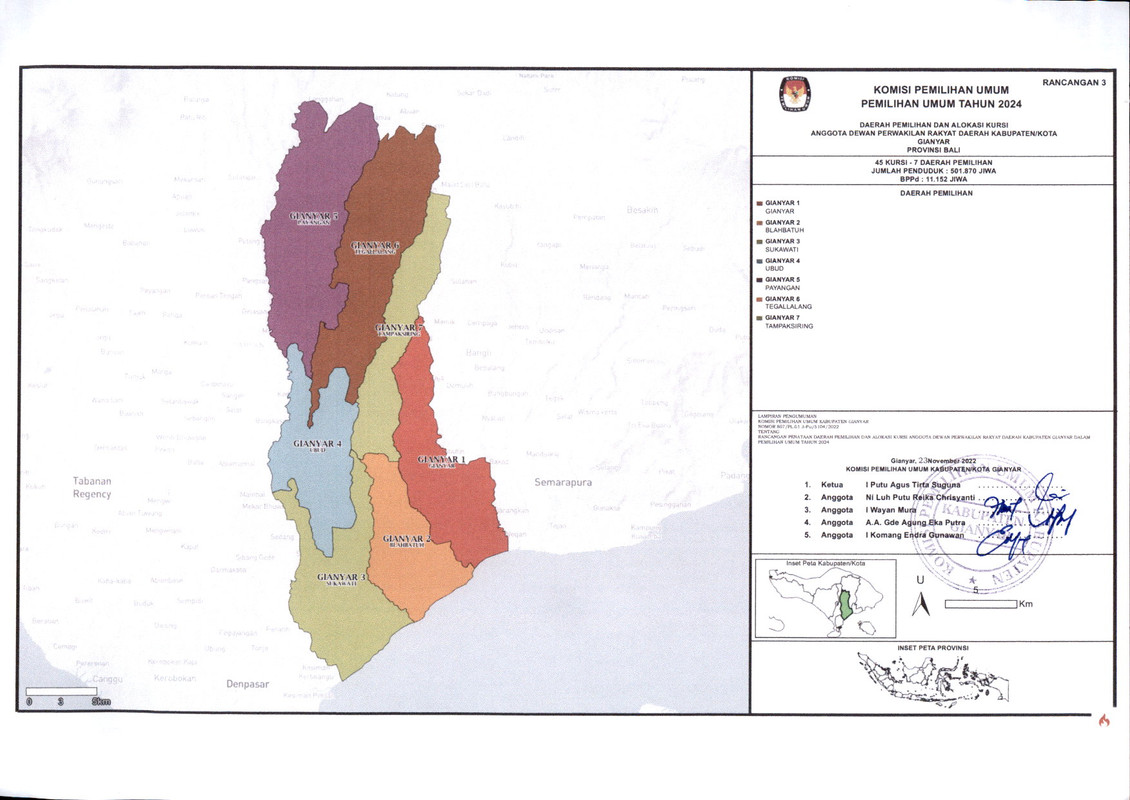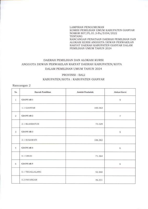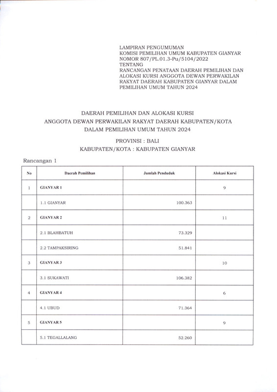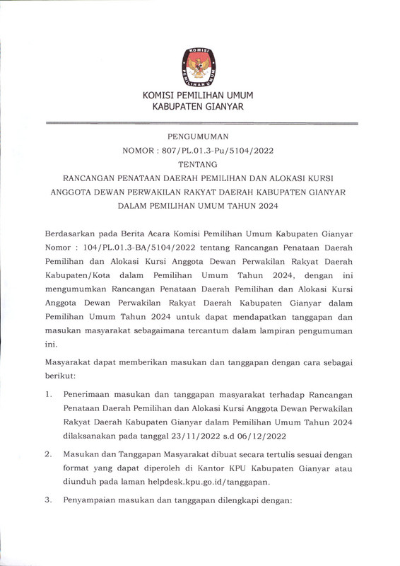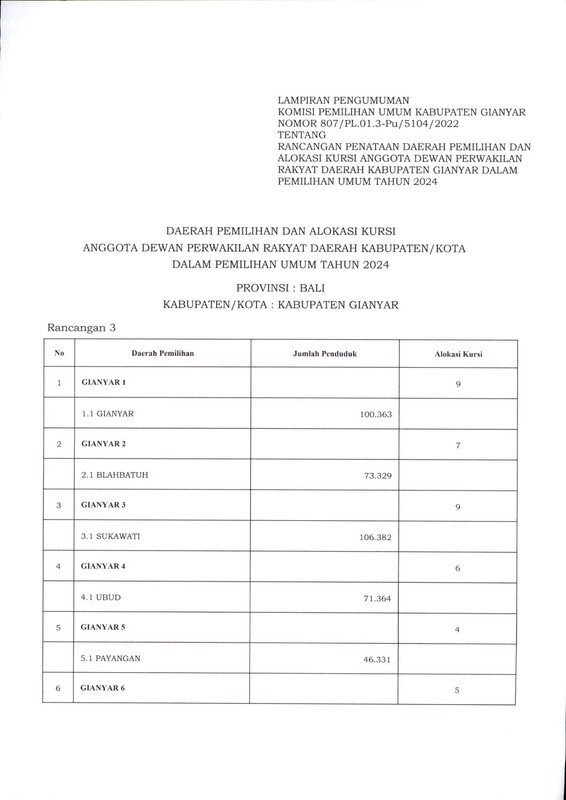 PENGUMUMAN RANCANGAN PENATAAN DAERAH PEMILIHAN DAN ALOKASI KURSI ANGGOTA DEWAN PERWAKILAN RAKYAT DAERAH KABUPATEN GIANYAR DALAM PEMILIHAN UMUM TAHUN 2024