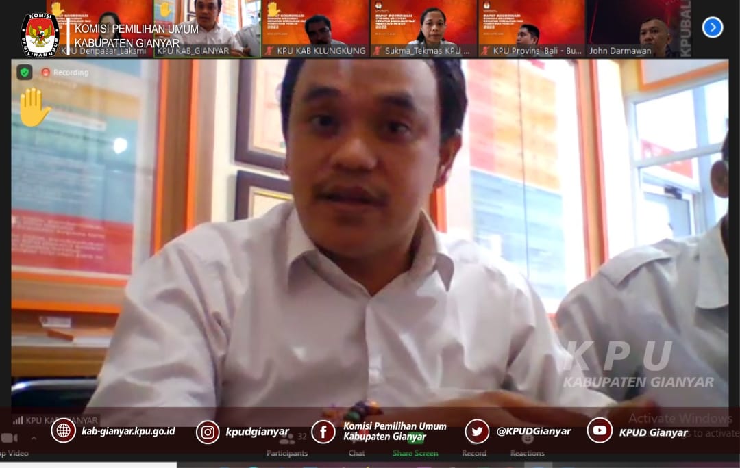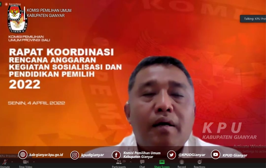 Gianyar, kab-gianyar.kpu.go.id – Anggota KPU Divisi Sosialisasi, Pendidikan Pemilih, Partisipasi Masyarakat, dan SDM, Sekretaris, serta Kepala Sub Bagian Teknis Penyelenggaraan Pemilu, Partisipasi dan Hubungan Masyarakat Sekretariat KPU Kabupaten Gianyar menghadiri Rapat Koordinasi Rencana Anggaran Kegiatan Sosialisasi dan Pendidikan Pemilih 2022 secara daring, Senin (4/4/2022).