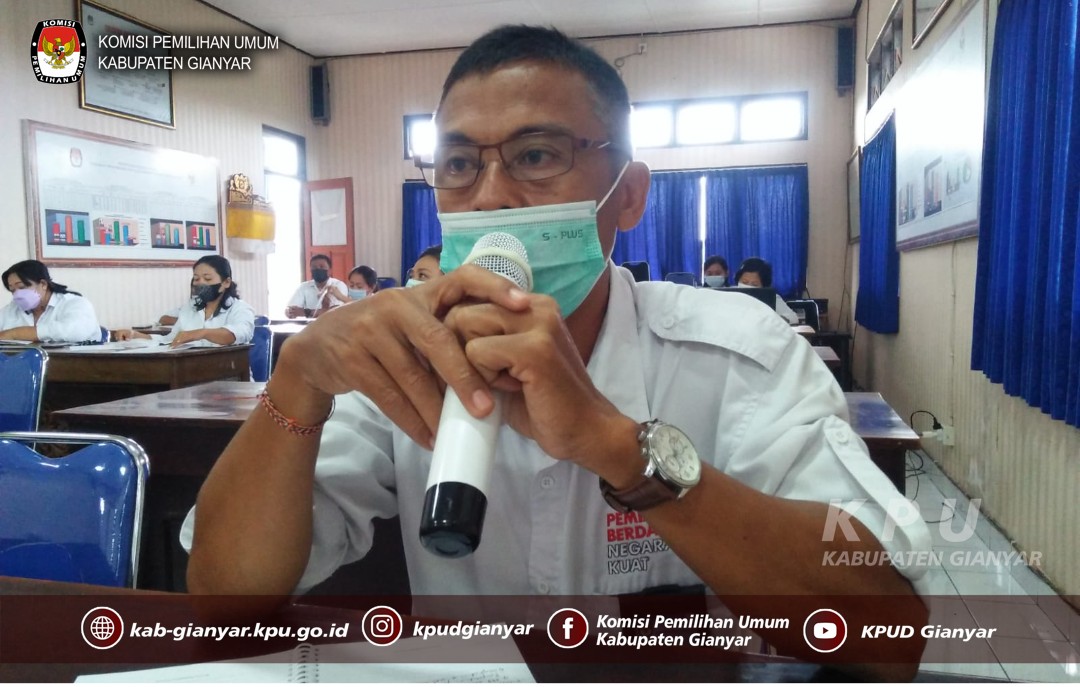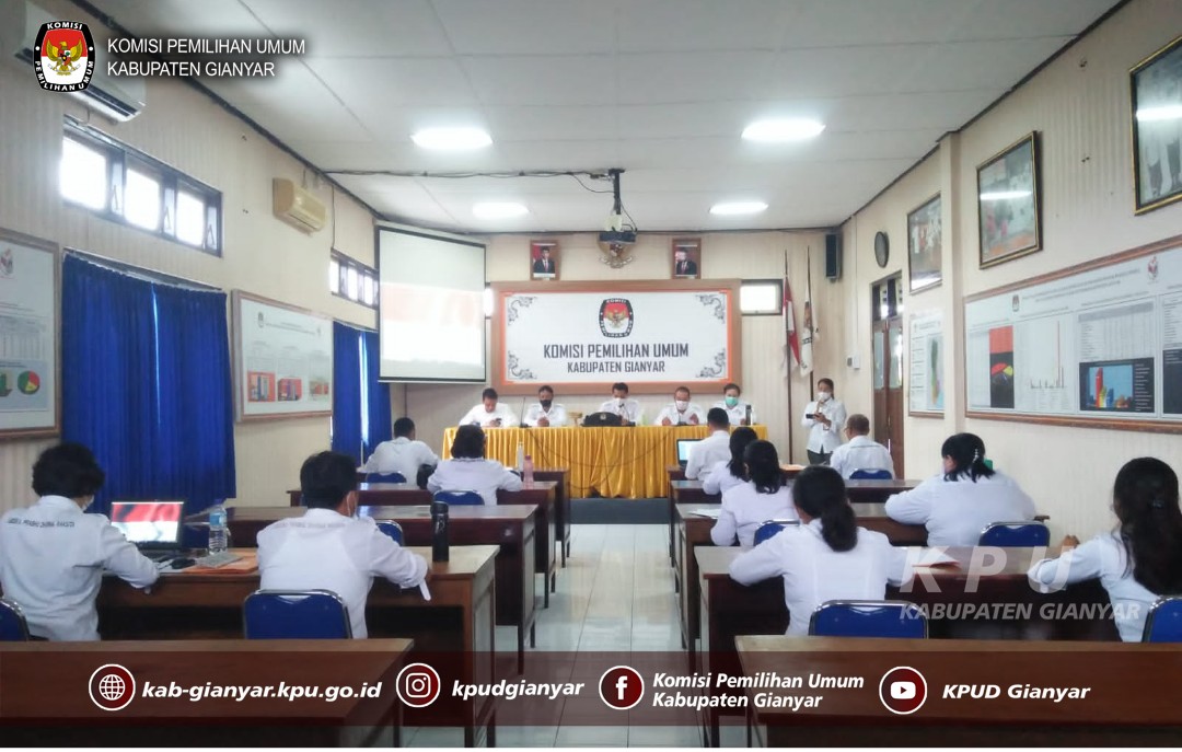 KPU Kabupaten Gianyar melaksanakan rapat pleno rutin di ruang rapat KPU Kabupaten Gianyar, yang dipimpin oleh Ketua KPU Gianyar I Putu Agus Tirta Suguna bersama para Anggota, diikuti oleh Sekretaris, para Kasubag, dan staf sekretariat KPU Kabupaten Gianyar yang melaksanakan WFO pada hari Senin, (21/2/2022).