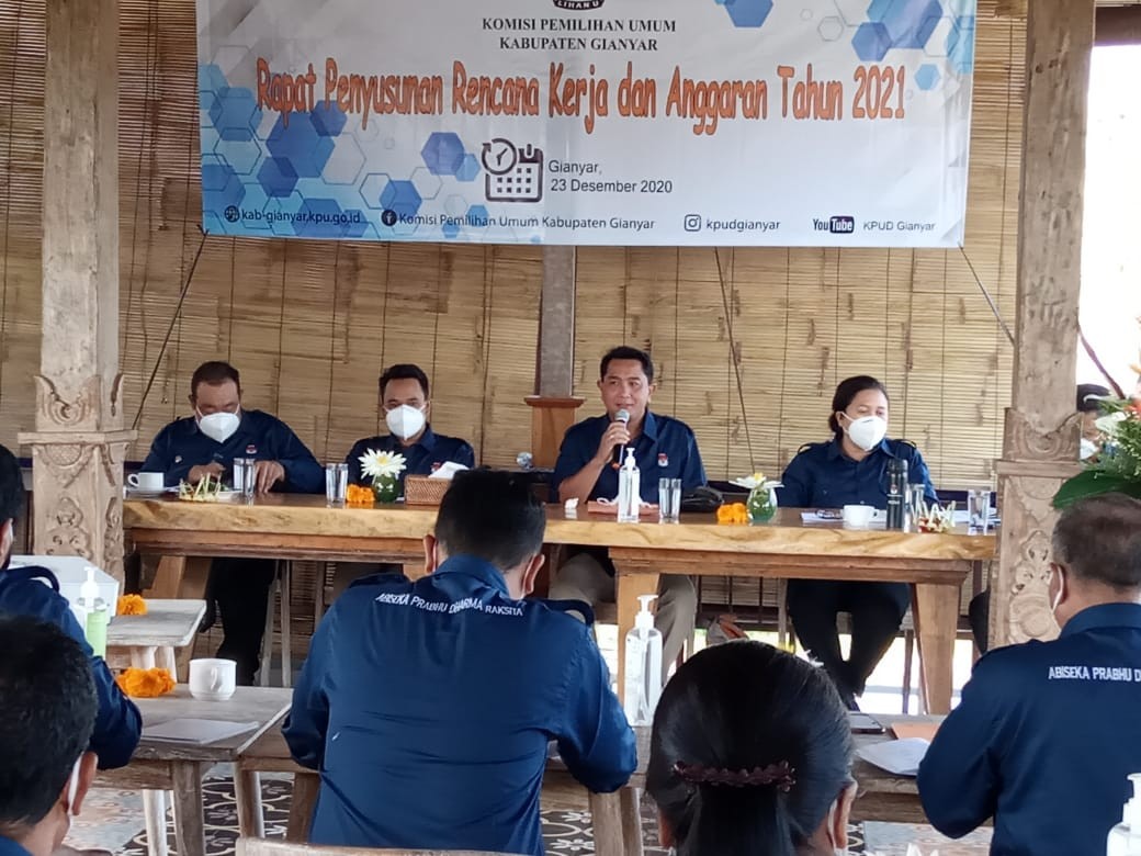 Rapat Kerja diawali dengan evaluasi kegiatan 2020 dan penyampaian rencana kerja tahun anggaran 2021 masing - masing divisi dan sub bagian. Melalui pencermatan anggaran DIPA TA 2021 yang secara resmi diterima tanggal 23 November 2020, telah disusun rencana 2021 dengan besaran Pagu DIPA KPU Kabupaten Gianyar tahun anggaran 2021 yang akan diterima adalah sejumlah 2.636.177.000, (dua milyar enam ratus tiga puluh enam juta seratus tujuh puluh tujuh ribu rupiah) yang mencakup program dukungan manajemnen dan pelaksanaan teknis lainnya serta program penguatan kelembagaan demokrasi dan perbaikan proses politik.