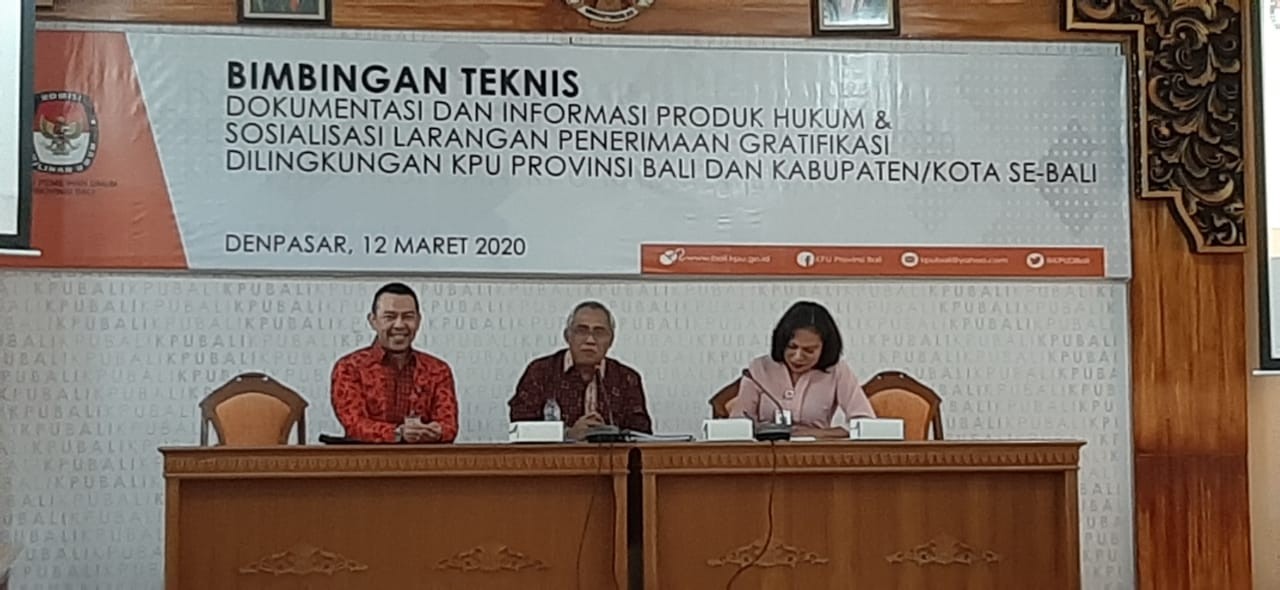 Dalam rangka peningkatan kapasitas pengelolaan produk hukum, KPU Kabupaten Gianyar mengikuti Bimtek Teknis (bimtek) Dokumentasi Dan Informasi Produk Hukum Dan Sosialisasi Larangan Penerimaan Gratifikasi Di Lingkungan KPU Provinsi Bali dan KPU Kab/Kota. Kegiatan berlangsung pada hari Kamis, 12/3/2020 bertempat di ruang rapat KPU Provinsi Bali, Jalan Cok Agung Tresna, Denpasar dengan menghadirkan narasumber yaitu Kepala Biro Hukum KPU RI Sigit Joyowardono, serta Reynald Saputra selaku Kasubbid Pemberdayaan Penguatan Jaringan Badan Pembinaan Hukum Nasional (BPHN) Kemenkumham. Bimtek yang diselenggarakan KPU Provinsi Bali ini diikuti oleh seluruh komisioner, sekretaris, dan Kasubbag Hukum KPU Kabupaten/Kota se Bali.