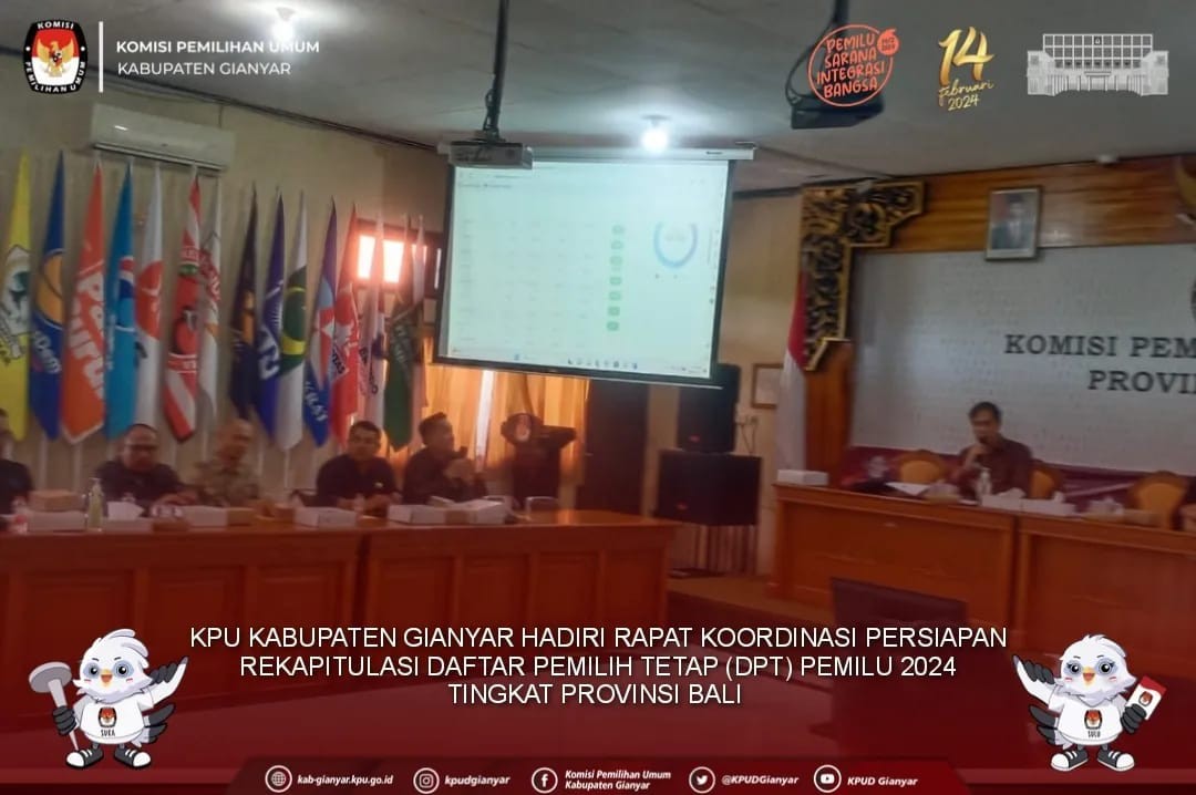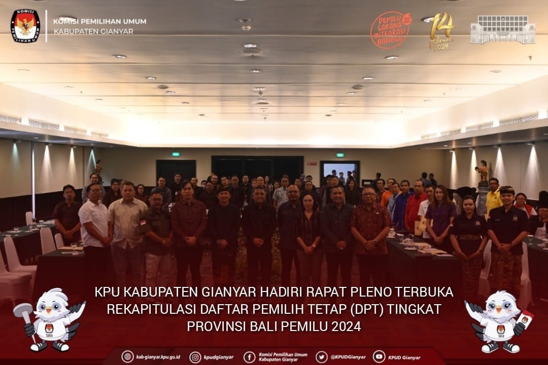 Denpasar, kab-gianyar.kpu.go.id - #TemanPemiih KPU Kabupaten Gianyar hadiri Rapat Pleno Terbuka Rekapitulasi Daftar Pemilih Tetap (DPT) Tingkat Provinsi Bali Pemilu 2024, bertempat di Hotel Prime Plaza Sanur, Rabu (28/06/2023) Acara dihadiri oleh Pimpinan KPU Provinsi Bali, Pimpinan Forkompinda Provinsi Bali, Bawaslu Provinsi Bali, Partai Politik Peserta Pemilu Tahun 2024, Ketua dan Divisi Perencanaan, Data dan Informasi serta Admin, Operator Sidalih KPU Kabupaten/Kota se-Bali. Rapat Pleno dibuka oleh Ketua KPU Provinsi Bali, I Dewa Agung Gede Lidartawan dengan menyampaikan harapannya data pemilih yang ditetapkan ini merupakan data pemilih yang valid yang merupakan kesepakatan bersama stakeholder, partai politik dan KPU Kabupaten/Kota. Dilanjutkan pembacaan tata tertib oleh Anggota KPU Provinsi Bali, John Darmawan. Pembacaan Berita Acara Lokasi Khusus di Wilayah Provinsi Bali oleh I Gusti Ngurah Darmasanjaya. Dilanjutkan pembacaan Berita Acara dan Lampiran oleh A.A. Gede Raka Nakula. Pembacaan SK Penetapan DPT Pemilu 2024 di KPU Provinsi Bali oleh Ketua KPU Provinsi Bali, I Dewa Agung Gede Lidartawan yaitu Jumlah Kabupaten sebanyak 9 Kabupaten, Jumlah Kecamatan 57, Jumlah desa/kelurahan 12.809, Jumlah pemilih laki-laki sebanyak 1.617.276 pemilih, jumlah pemilih perempuan sebanyak 1.652.240 pemilih maka total pemilih se-Provinsi Bali sebanyak 3.269.516 pemilih. Kegiatan diakhiri dengan penyerahan Berita Acara dan Lampiran DPT Pemilu 2024 kepada Pimpinan Forkompinda Provinsi Bali, Ketua Bawaslu Provinsi Bali, dan Partai Politik Peserta Pemilu Tahun 2024. (Tr) #KPUMelayani #PemiluSerentak2024