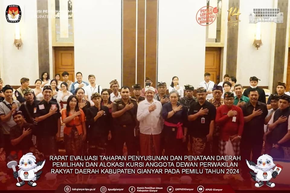 Ubud, kab-gianyar.kpu.go.id - #TemanPemiih KPU Kabupaten Gianyar menyelenggarakan Rapat Evaluasi Tahapan Penyusunan Penataan Daerah Pemilihan dan Alokasi Kursi Anggota Dewan Perwakilan Rakyat Daerah Kabupaten Gianyar pada Pemilu tahun 2024, Kamis (8/6). Hadir sebagai peserta rapat evaluasi yakni Polres Gianyar, Dandim 1616 Gianyar, Kejaksaan Negeri Gianyar, Kesbangpol, Disdukcapil, Dinas Pemberdayaan Masyarakat dan Desa Kabupaten Gianyar, PPK se-Kabupaten Gianyar, serta Pengurus Partai Politik peserta Pemilu tahun 2024 se-Kabupaten Gianyar.