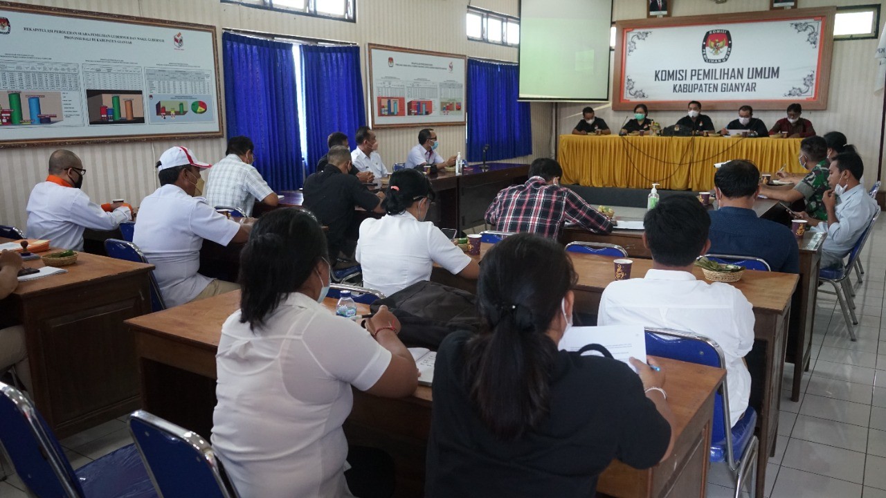 KPU Kabupaten Gianyar melaksanakan Rapat Koordinasi Pemutakhiran Data Pemilih Berkelanjutan (PDPB) Bulan Desember Tahun 2021 Triwulan Keempat (IV) Pada hari hari Rabu (8/12/2021) . Rapat koordinasi yang dilaksanakan Secara Luring tersebut tetap memperhatikan protokol kesehatan dengan menjaga jarak dan memakai masker. Rapat Koordinasi ini dihadiri oleh Bawaslu Kabupaten Gianyar, Kapolres Gianyar, Dandim 1616 Gianyar, Badan Kesbangpol Kabupaten Gianyar, Dinas Pemberdayaan Masyarakat Desa Kabupaten Gianyar, Dinas Informasi dan Komunikasi Kabupaten Gianyar, dan pimpinan/pengurus Partai Politik se-Kabupaten Gianyar.