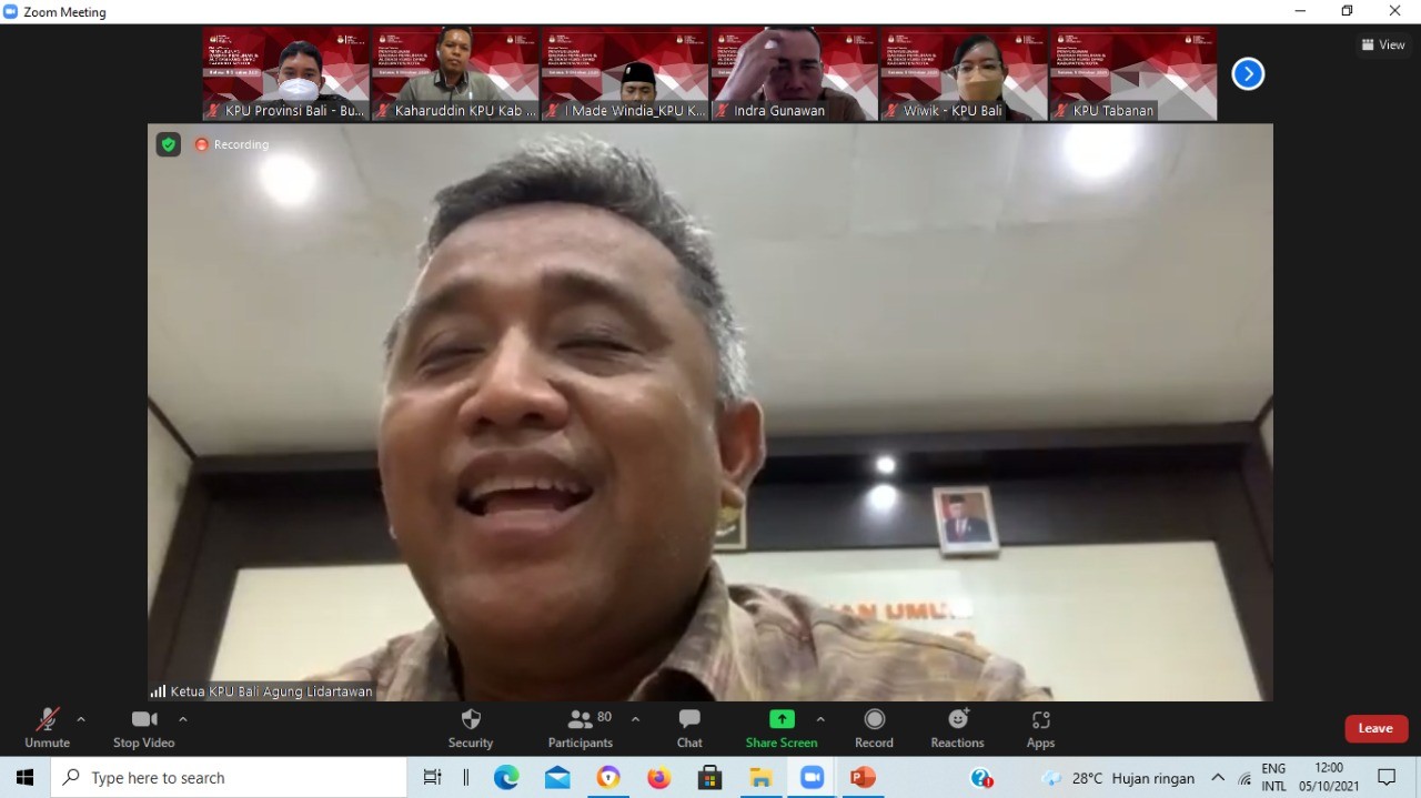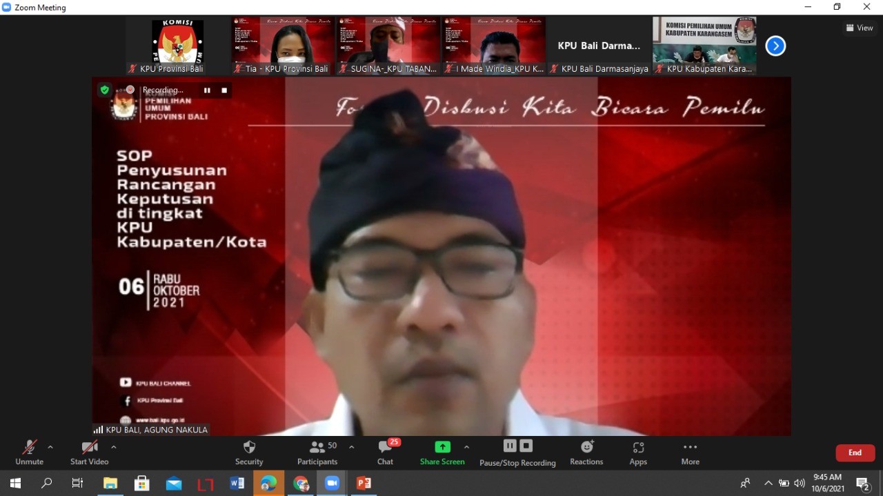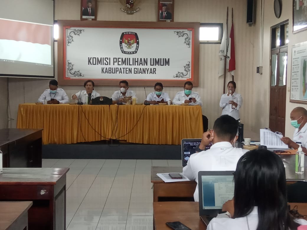 Komisi Pemilihan Umum Kabupaten Gianyar mengikuti Diskusi Hukum bertemakan SOP Penyusunan rancangan Keputusan di Tingkat KPU Kabupaten/Kota yang diselenggarakan oleh KPU Provinsi Bali, Rabu (6/10/2021) secara daring. Selaku narasumber dalam program divisi hukum KPU se-Bali yang diberi tajuk "Forum Diskusi Kita Bicara Pemilu" yaitu anggota KPU Kabupaten Bangli, Divisi Hukum & Pengawasan Gede P. Roy Suparman. Dalam materinya, komisioner yang akrab disapa Pak Roy ini mengatakan pentingnya teamwork dalam penyusunan keputusan, dan juga SOP sebagai keharusan dalam setiap tahapan. Sementara itu Anggota KPU Provinsi Bali Divisi Hukum dan Pengawasan, A.A. Gede raka Nakula yang menggagas acara ini menyampaikan arahannya mengenai sejumlah fungsi penting SOP. Menurutnya SOP dapat menjadi tolak ukur keberhasilan ataupun kegagalan sebuah kegiatan. Jika terjadi permasalahan, satker dapat merujuk ke SOP untuk mengetahui di mana sumbernya, sehingga SOP secara langsung dapat menilai integritas pelaksana kegiatan. SOP juga sebagai acuan, pedoman kegiatan serta dapat menjadi sarana pembantu dalam antisipasi sengketa. Terkait penyusunan SOP, Agung Nakula mengatakan masing-masing satker tentunya wajib menyusun sendiri menyesuaikan dengan kebutuhan dan kondisi di masing-masing daerah. Acara tersebut direncanakan akan digelar secara rutin setiap minggunya dengan menghadirkan narasumber dan topik yang berbeda.