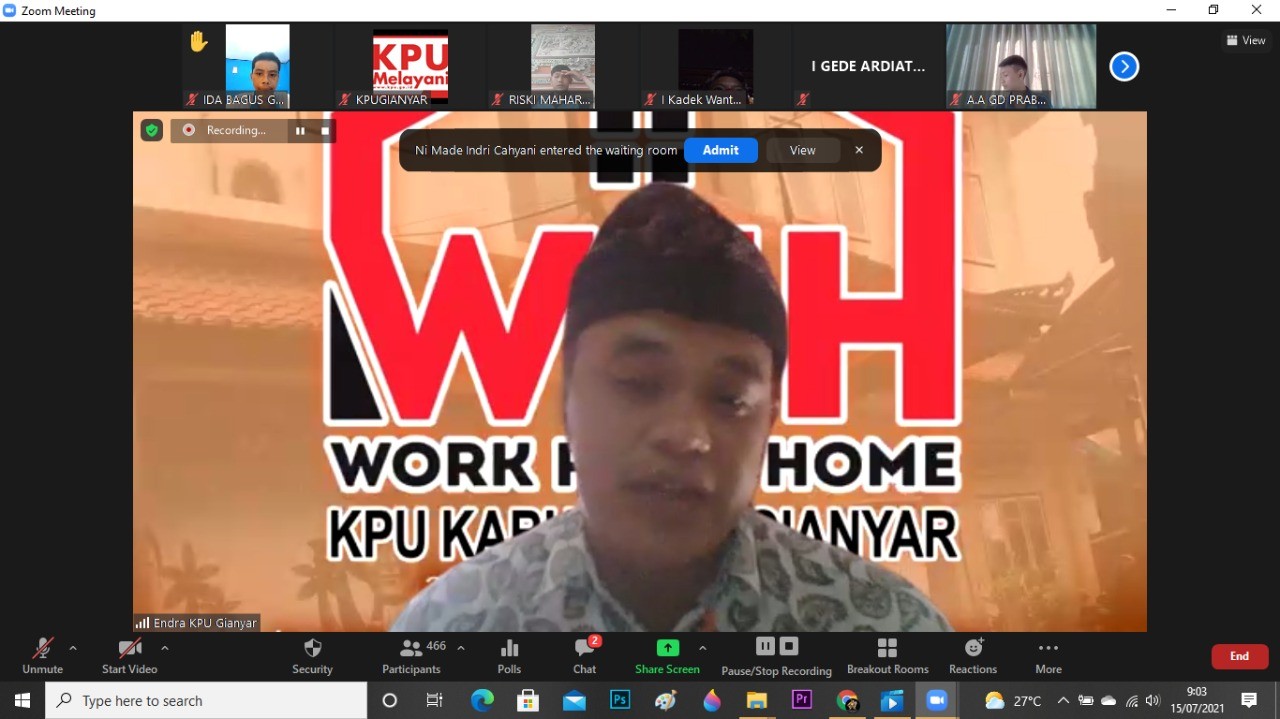 KPU Kabupaten Gianyar, Jumat, 16//7/2021 mengikuti diskusi dalam jaringan (daring) mengenai SPIP terkait Penguatan Produk Hukum dan Antisipasi Sengketa yang diselenggarakan oleh KPU Provinsi Bali. Pertemuan kali ini mengundang Divisi Hukum dan Pengawasan dan Kasubag Hukum dibuka oleh Anggota KPU Bali I Gede John Darmawan yang menyampaikan kepada seluruh peserta agar hasil diskusi ini lebih meningkatkan penguatan pengawasan produk hukum di lingkungan KPU Kabupaten/Kota.