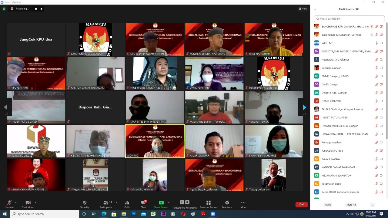 KPU KABUPATEN GIANYAR (20/5/2021), Keberadaan Badan Koordinasi Kehumasan atau BAKOHUMAS dalam penyebaran informasi dan sarana komunikasi antara KPU dengan instansi terkait sangat penting untuk segera diwujudkan dalam rangka penyelenggaran Pemilu Serentak 2024, melalui Bakohumas diharapkan dapat terjalin komunikasi dalam menyerap aspirasi dan masukan oleh berbagai unsur masyarakat terhadap program kegiatan KPU khususnya program kerja KPU Kabupaten Gianyar. Demikian disampaikan oleh Ketua KPU Gianyar I Putu Agus Tirta Suguna dalam kesempatan membuka acara Sosialisasi pembentukan Bakohumas yang di gelar secara Daring, Kamis (20/5). Di hadapan peserta sosialisasi yang di gelar dengan melibatkan Unsur Forkopimda, Pimpinan OPD Kabupaten Gianyar, Partai Politik, Organisasi masyarakat dan Kepala sekolah negeri se- Kabupaten Gianyar, Anggota KPU Provinsi Bali John Darmawan menjelaskan Bakohumas juga berfungsi sebagai media edukasi dan pendidikan pemilih bagi masyarakat gianyar melalui peran aktif serta kerjasama dari seluruh stakeholder di Kabupaten Gianyar yang terlibat dalam forum Bakohumas dengan secara aktif ikut menyebarkan informasi yang bersumberkan pada KPU Gianyar. Pada kesempatan yang sama, Anggota KPU Kabupaten Gianyar Divisi Sosialisasi dan Parmas Komang Endra Gunawan memaparkan materi tentang tujuan dan fungsi dari pembentukan Bakohumas pada KPU Kabupaten Gianyar yang dilaksanakan dengan melibatkan unsur Pemerintah daerah maupun organisasi kemasyarakatan dalam upaya meningkatkan publikasi informasi kepemiluan, sehingga diharapkan dapat meningkatkan pertisipasi masyarakat pada Kabupaten Gianyar dalam Pemilu Serentak 2024. Acara sosialisasi tersebut diakhiri dengan sesi tanya jawab dan saran masukan dari peserta sosialisasi yang dipandu oleh Ketua Divisi Teknis Penyelenggara KPU Kabupaten Gianyar, Luh Putu Reika Chrisyanti.(Pik)