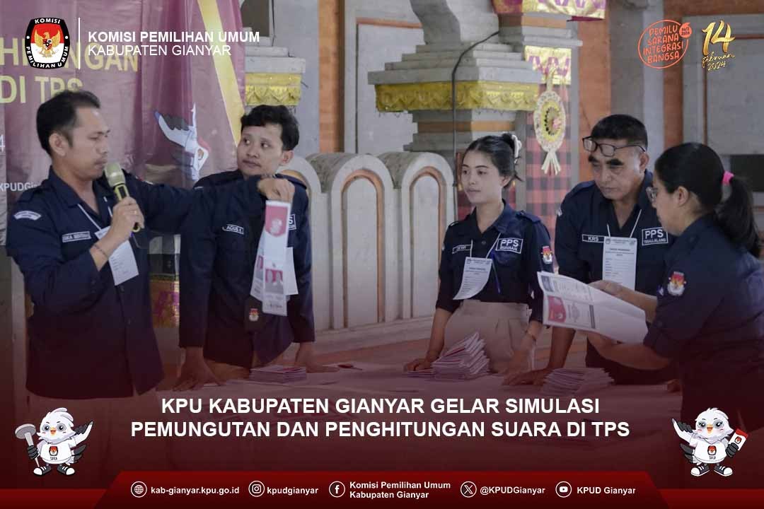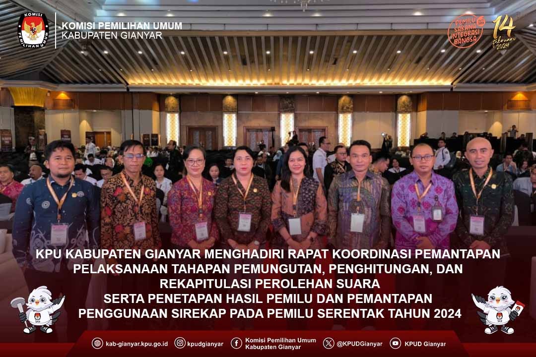 Jakarta, kab-gianyar.kpu.go.id - #TemanPemilih Ketua dan Anggota KPU Kabupaten Gianyar I Wayan Mura dan Ni Made Suniari beserta Kasubag Teknis dan Parmas, Agus Dian Juliharta mengikuti Rapat Koordinasi Pemantapan Pelaksanaan Tahapan Pemungutan, Penghitungan dan Rekapitulasi Perolehan Suara serta Penetapan Hasil Pemilu dan Pemantapan Penggunaan Sirekap pada Pemilu Serentak Tahun 2024, bersama KPU/KIP Kabupaten/Kota se-Indonesia, di Jakarta, Kamis (18/1/2024). Rapat koordinasi dibuka oleh Ketua KPU RI, Hasyim Asy'ari yang menyampaikan beragam hal, mulai kesiapan pembentukan KPPS, teknis pengelolaan logistik hingga ke TPS serta pemanfaatan Sirekap sebagai alat bantu. Pada sesi pengarahan, Idham menyampaikan Keputusan KPU Nomor 66 Tahun 2024 terkait Pedoman Teknis Pemungutan dan Penghitungan Suara. Afif menyampaikan regulasi pemilu yang dapat menjadi pegangan jajaran KPU melaksanakan Pemilu 2024. Sedangkan Drajat menyampaikan perkembangan pengadaan logistik dan harapan agar jajaran KPU menyiapkan diri menghadapi proses distribusi hingga ke TPS. Pada hari kedua materi bimbingan teknis sesi pertama diisi oleh instansi terkait yang membahas mengenai dukungan pemerintah dalam pelaksanaan pemungutan dan penghitungan suara dan sesi ke 2 mengenai pembahasan dan simulasi penggunaan aplikasi sirekap mobile serra sirekap website. Hari ketiga bimbingan teknis peserta melaksanakan pemantapan aplikasi sirekap dan evaluasi serta pembahasan daftar inventarisasi penggunaaan aplikasi sirekap. Bimbingan teknis di tutup oleh Anggota KPU RI Divisi Teknis Penyelenggaraan Bapak Idham Holik Hadir mengikuti rangkaian kegiatan bimtek, Pejabat Eselon II di Lingkungan KPU, Ketua, Anggota KPU Provinsi/KIP Aceh Divisi Teknis serta operator se Indonesia sebagai peserta. (AgsD) #KPUMelayani #PemiluSerentak2024
