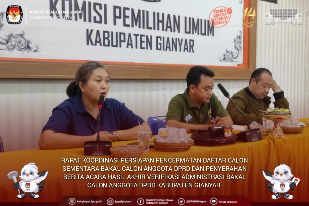 Anggota KPU Kabupaten Gianyar Divisi Hukum dan Pengawasan dan Kepala Sub Bagian Hukum dan SDM, menghadiri kegiatan Rapat Koordinasi KPU dengan KPU Provinsi dan KPU Kabupaten/Kota Dalam Rangka Peningkatan Kepasitas Penyusunan Produk Hukum Bagi KPU Provinsi dan KPU Kabupaten/Kota Seluruh Indonesia, Gelombang II, di Tangerang, Banten, Minggu (6/8/2023). Acara dibuka oleh Ketua KPU Hasyim Asy'ari, Anggota KPU Mochammad Afifuddin, Idham Holik, August Mellaz, Yulianto Sudrajat, Parsadaan Harahap bersama Sekretaris Jenderal KPU Bernad Dermawan Sutrisno. Dalam sambutan pembukaannya, Hasyim mengatakan rakor ini diselenggarakan untuk memastikan semua produk hukum KPU seragam cara pandang dan pemahamannya. Rakor juga diperlukan bagi sekretariat Acara dibuka oleh Ketua KPU Hasyim Asy'ari, Anggota KPU Mochammad Afifuddin, Idham Holik, August Mellaz, Yulianto Sudrajat, Parsadaan Harahap bersama Sekretaris Jenderal KPU Bernad Dermawan Sutrisno. Dalam sambutan pembukaannya, Hasyim mengatakan rakor ini diselenggarakan untuk memastikan semua produk hukum KPU seragam cara pandang dan pemahamannya. Rakor juga diperlukan bagi sekretariat untuk penyegaran kembali demi menjaga produk hukum yang dikeluarkan berkualitas dan sesuai aturan perundangan. Sementara itu Divisi Hukum dan pengawasan Mochammad Afifuddin menyampaikan pentingnya rakor ini untuk menyeragamkan segala hal, termasuk produk-produk yang harus dibuat oleh KPU. Kepada jajarannya, Sekretaris Jenderal KPU bahwa tujuan dari rakor ini menjadikan pesertanya memahami tugas dalam memberikan dukungan teknis dan administrasi yang semua berkonsekuensi hukum mulai dari produk hukum yang sederhana dan sehari-hari seperti surat menyurat, hingga berita acara pleno rutin yang perlu disusun dengan baik karena hal-hal tersebut berkonsekuensi hukum. Dalam Rakor tersebut dihadirkan sejumlah narasumber yakni, Anggota KPU periode 2012-2017 Ida Budhiati, Deputi Bidang Dukungan Teknis Eberta Kawima, Inspektur Utama Nanang Priyatna, Fungsional Penata Acara dibuka oleh Ketua KPU Hasyim Asy'ari, Anggota KPU Mochammad Afifuddin, Idham Holik, August Mellaz, Yulianto Sudrajat, Parsadaan Harahap bersama Sekretaris Jenderal KPU Bernad Dermawan Sutrisno. (Kr) #KPUMelayani #PemiluSerentak2024 #KPUGianyar