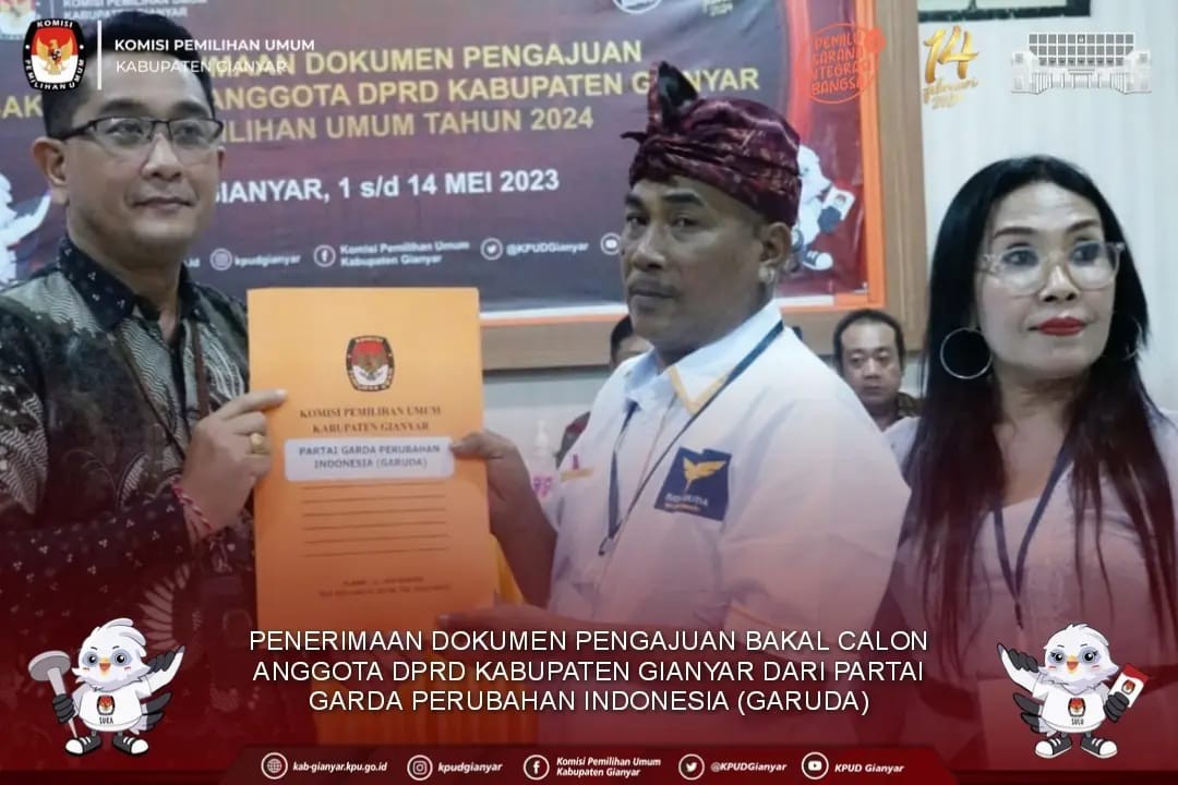 Partai Garuda merupakan Partai Politik kesebelas yang melakukan pengajuan dokumen bakal calon anggota DPRD Kabupaten Gianyar pada KPU Kabupaten Gianyar. Dalam kesempatan tersebut, turut hadir Bawaslu Kabupaten Gianyar.