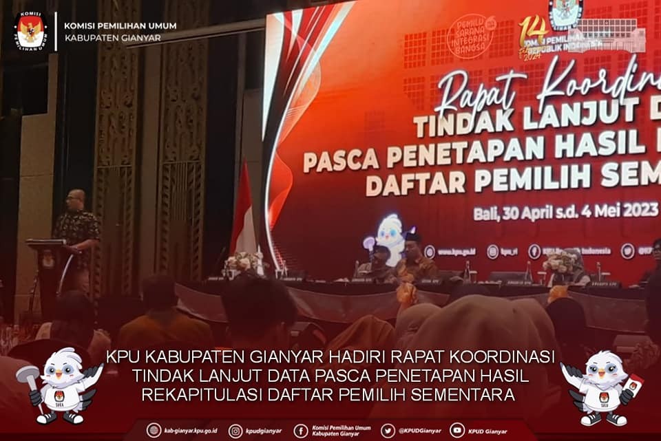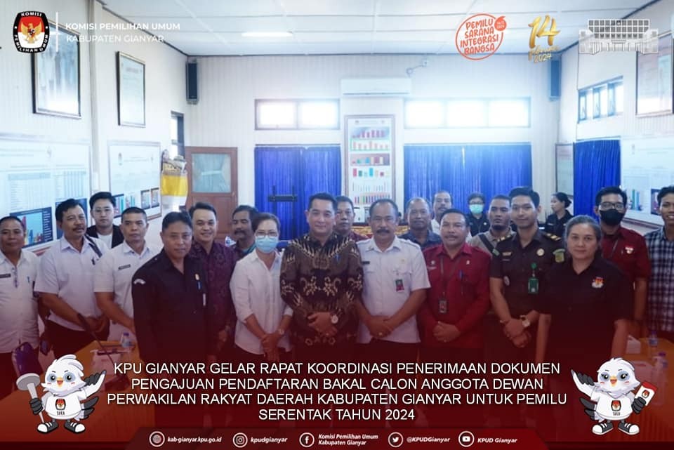 Gianyar, kab-gianyar.kpu.go.id - #TemanPemilih KPU Kabupaten Gianyar melaksanakan Rapat Koordinasi Penerimaan Dokumen Pengajuan Bakal Calon Anggota DPRD Kabupaten Gianyar untuk Pemilu Serentak Tahun 2024 pada Rabu (3/5) yang bertempat di Ruang Rapat Kantor KPU Kabupaten Gianyar. Acara dipimpin oleh Ketua beserta anggota KPU Kabupaten Gianyar dan dihadiri oleh Dinas Pendidikan, Pemuda, dan Olahraga Provinsi Bali, BNNK Gianyar, Kepala Rutan Kelas IIB Gianyar, Kesbangpol Kabupaten Gianyar, Kapolres Gianyar, Pengadilan Negeri Gianyar, Kejaksaan Negeri Gianyar, Bawaslu Kabupaten Gianyar, serta Ketua PPK se-Kabupaten Gianyar.