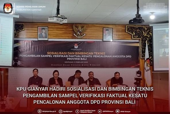 Denpasar, kab-gianyar.kpu.go.id - #TemanPemilih Divisi Teknis Penyelenggaraan KPU Kabupaten Gianyar menghadiri Sosialisasi dan Bimbingan Teknis Pengambilan Sampel Verifikasi Faktual kesatu Pencalonan Anggota DPD Provinsi Bali, bertempat di Ruang Rapat KPU Bali, Minggu (05/02/2023).