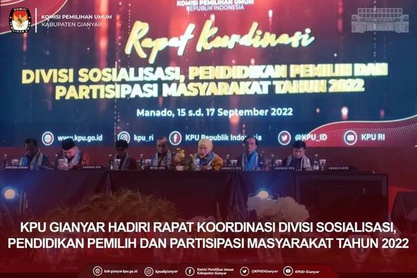 Manado, kab-gianyar.kpu.go.id - #temanpemilih Divisi Sosialisasi, Pendidikan Pemilih, Partisipasi Masyarakat dan SDM, I Komang Endra Gunawan, bersama Kasubbag Teknis Penyelenggaraan Pemilu, Partisipasi, dan Hubungan Masyarakat KPU Kabupaten Gianyar menghadiri Rapat Koordinasi Divisi Sosialisasi, Pendidikan Pemilih, dan Partisipasi Masyarakat Tahun 2022, bertempat di Grand Kawanua International City Novotel Manado pada tanggal 15 -17 September 2022. Rakor yang diikuti oleh 1.007 peserta terdiri dari Divisi Sosdiklih, Kepala Bagian KPU Provinsi dan Kepala Sub Bagian KPU Kabupaten/Kota se-Indonesia dibuka oleh Ketua KPU Hasyim Asy’ari, yang menyatakan bahwa dalam Rakor akan dibahas tentang info strategis untuk menggerakkan pemilih sehingga berpartisipasi baik sebagai badan adhoc serta turut hadir di TPS sehingga dapat meningkatkan partisipasi pemilih pada Tahun 2024. Turut pula memberi sambutan Kepala Biro Partisipasi dan Hubungan Masyarakat, Cahyo Ariawan, serta Ketua KPU Sulawesi Utara, Ardiles Mewoh. Dilanjutkan dengan pengarahan dari Ketua Divisi Sosialisasi, Pendidikan Pemilih, dan Partisipasi Masyarakat, August Mellaz, yang menyampaikan bahwa tahun 2023 dapat membuat mitigasi partisipasi masyarakat, dimana KPU dapat sebagai media yang terinformatif dalam penyampaian pengetahuan tentang Pemilu. Kegiatan rakor yang berlangsung selama tiga hari diisi dengan Diskusi dalam tiga panel, antara lain tentang arah kebijakan KPU dalam peningkatan parmas, strategi dan metode komunikasi publik, potret anak muda dan demokrasi, kolaborasi media, serta strategi mitigasi isu hoaks dan disinformasi Pemilu. Dilanjutkan dengan pengarahan dari Sekretaris Jenderal KPU, Bernad Dermawan Sutrisno terkait SDM, Sarana dan Prasarana KPU, Anggaran, serta Fasilitas Kesehatan bagi KPU. Rakor ditutup oleh Ketua KPU Hasyim Asy’ari dengan harapan dalam penyampaian pesan kepemiluan kepada publik agar tepat dalam memilih isi pesan, audiens, media, serta strategi yang digunakan. (Skm) #KPUMelayani #PemiluSerentak2024 #KPUGianyar