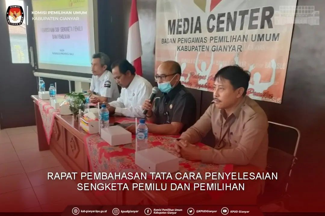Anggota KPU Kabupaten Gianyar, Divisi Hukum dan Pengawasan I Wayan Mura, SH menghadiri Acara Rapat Pembahasan SOP (Standar Operasional Prosedur) terkait tata cara penyelesaian sengketa proses pemilu dan pemilihan, bertempat di Kantor Bawaslu Gianyar, Rabu,(27/07/2022), yang dibuka oleh Ketua Bawaslu Gianyar, I Wayan Hartawan, S.H. Turut hadir Anggota Bawaslu Provinsi Bali, Koodinator Divisi Penanganan Sengketa, Ir.I Ketut Sunadra M.Si., yang menyampaikan pentingnya sinergi bagi sesama penyelenggara Pemilu. Sinergi sebagai upaya membangun dan memastikan hubungan kerjasama yang produktif dan harmonis untuk menghasilkan pemilu yang berkualitas. I Wayan Sola Sutirta selaku Kordiv Penanganan Sengketa Bawaslu Gianyar juga menyampaikan tentang Standar Operasional Persedur (SOP) disusun sebagai Tata cara Bawaslu dalam menerima pengaduan dan menyelesaikan permohonan sengketa proses ,yang diadukan oleh pemohon, biar ada alur yang jelas sebagai panduan. Pada kesempatan tersebut Anggota KPU Kabupaten Gianyar divisi Hukum dan Pengawasan, I Wayan Mura, S.H. juga berkesempatan menyampaikan terkait dengan pentingnya koordinasi dan komunikasi dalam mengantisipasi terjadinya potensi sengketa yang muncul di setiap tahapan, dengan pemahaman yang sama dalam memahami regulasi. (Mu)