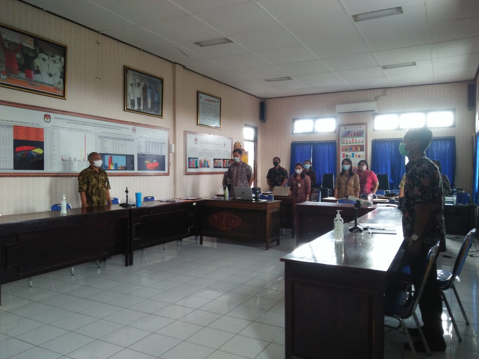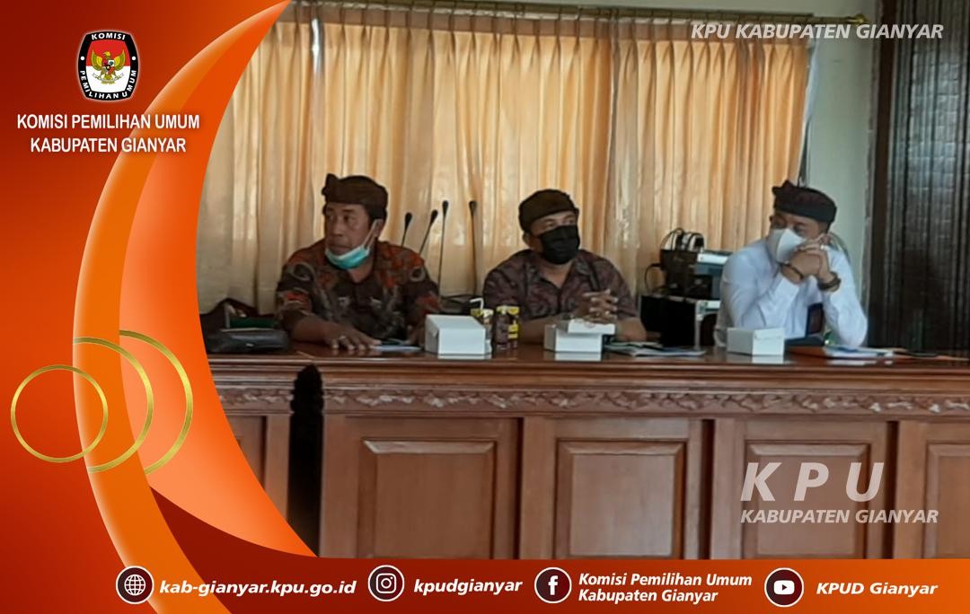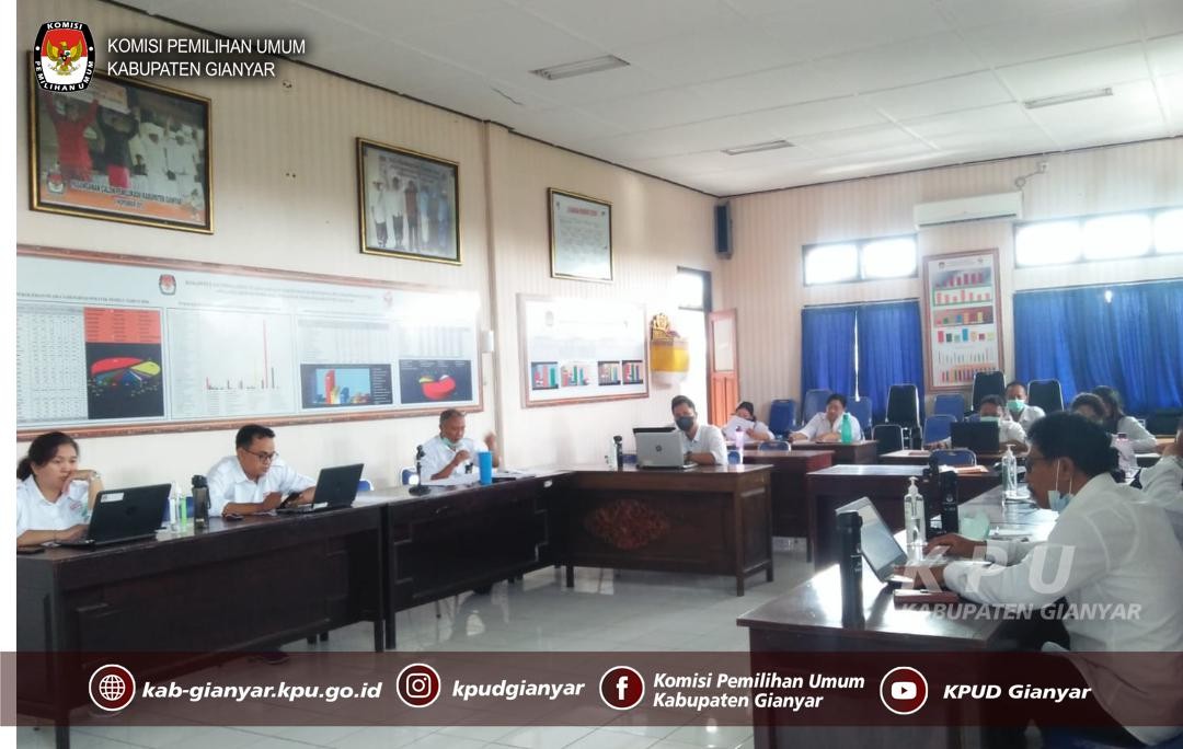 KPU Kabupaten Gianyar melaksanakan rapat pleno rutin di ruang rapat KPU Kabupaten Gianyar, yang dipimpin oleh Ketua KPU Gianyar I Putu Agus Tirta Suguna bersama para Anggota, diikuti oleh Sekretaris, para Kasubag, dan staf sekretariat KPU Kabupaten Gianyar, pada hari Jumat, (4/2/2022). Rapat pleno dilaksanakan dengan tetap mengikuti aturan jaga jarak yang aman (physical distance) dan penerapan protokol pencegahan penularan Covid-19 bagi peserta rapat.