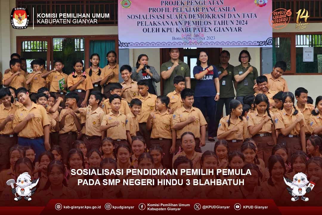 Blahbatuh, kab-gianyar.kpu.go.id -#TemanPemilih KPU Kabupaten Gianyar yaitu Kepala Sub Bagian Teknis dan Parmas, Agus Dian Juliharta beserta Staf menghadiri kegiatan Sosialisasi terkait dengan Demokrasi serta Tata Pelaksanaan Pemilihan Pengurus OSIS/MPK tahun 2024/2025 pada SMP Negeri Hindu 3 Blahbatuh, Jumat (8/12). Kegiatan diawali dengan sambutan singkat dari guru Pembina SMP Negeri Hindu 3 Blahbatuh dan dilanjutkan dengan pemaparan materi mengenai Pendidikan Pemilih Pemula yang bertempat di lapangan sekolah. Bertindak sebagai narasumber dalam kegiatan tersebut, Agus Dian memberikan sedikit pemaparan mengenai Demokrasi secara umum dan proses Pemilihan Umum. Agus Dian dalam pemaparannya menjelaskan bahwa adanya persamaan antara Pemilihan Umum dan Pemilihan Pengurus OSIS yang sama-sama memerlukan asas Luberjudil. Jalannya proses Sosialisasi tersebut berlangsung baik dengan interaksi dan antusias pada sesi tanya jawab dari siswa/siswi yang menyimak selama kegiatan berlangsung. (Yi) #KPUMelayani #PemiluSerentak2024