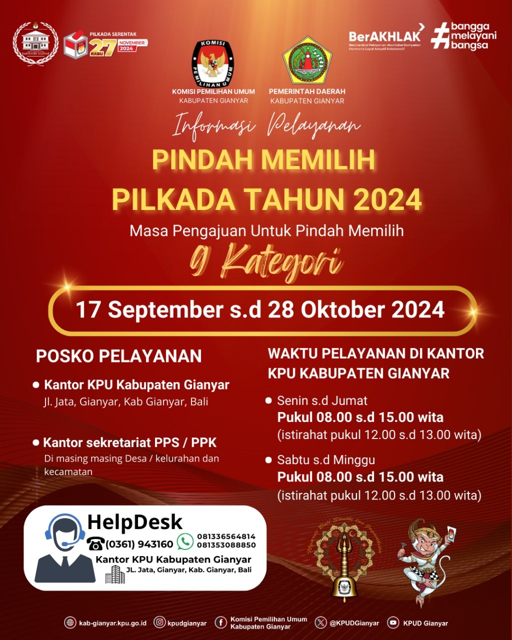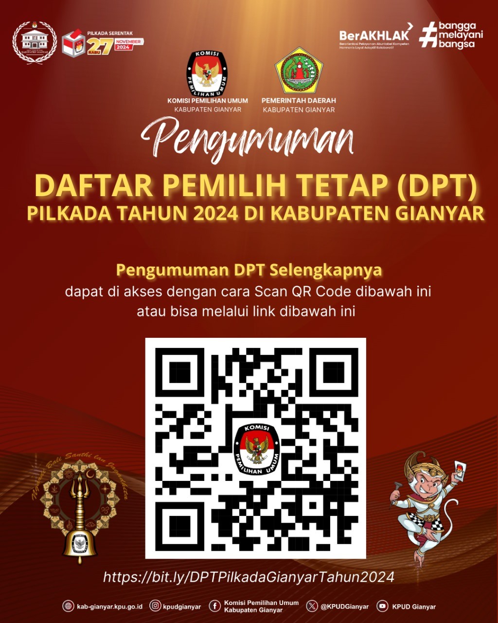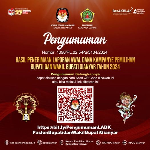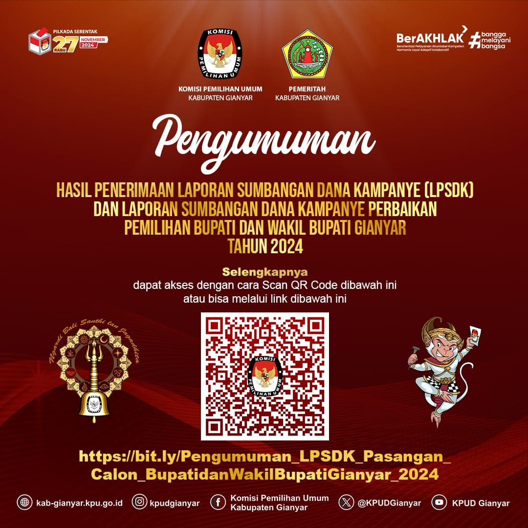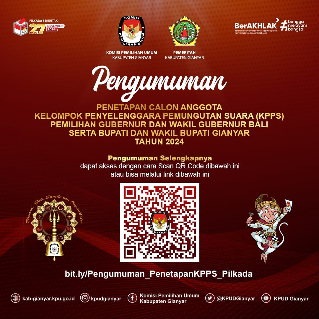 Sehubungan dengan hal tersebut di atas, KPU Kabupaten Gianyar mengundang calon anggota KPPS terpilih untuk hadir dalam pelantikan, pengambilan sumpah/janji, dan penandatanganan pakta integritas anggota KPPS pada: