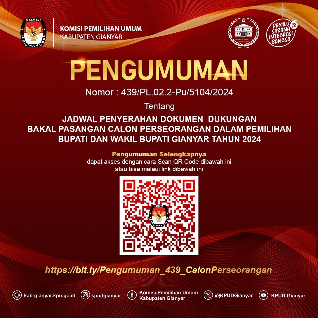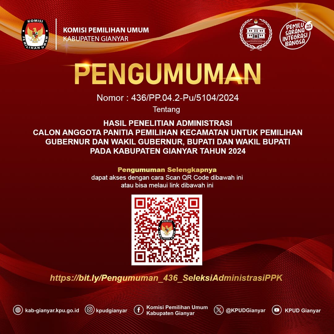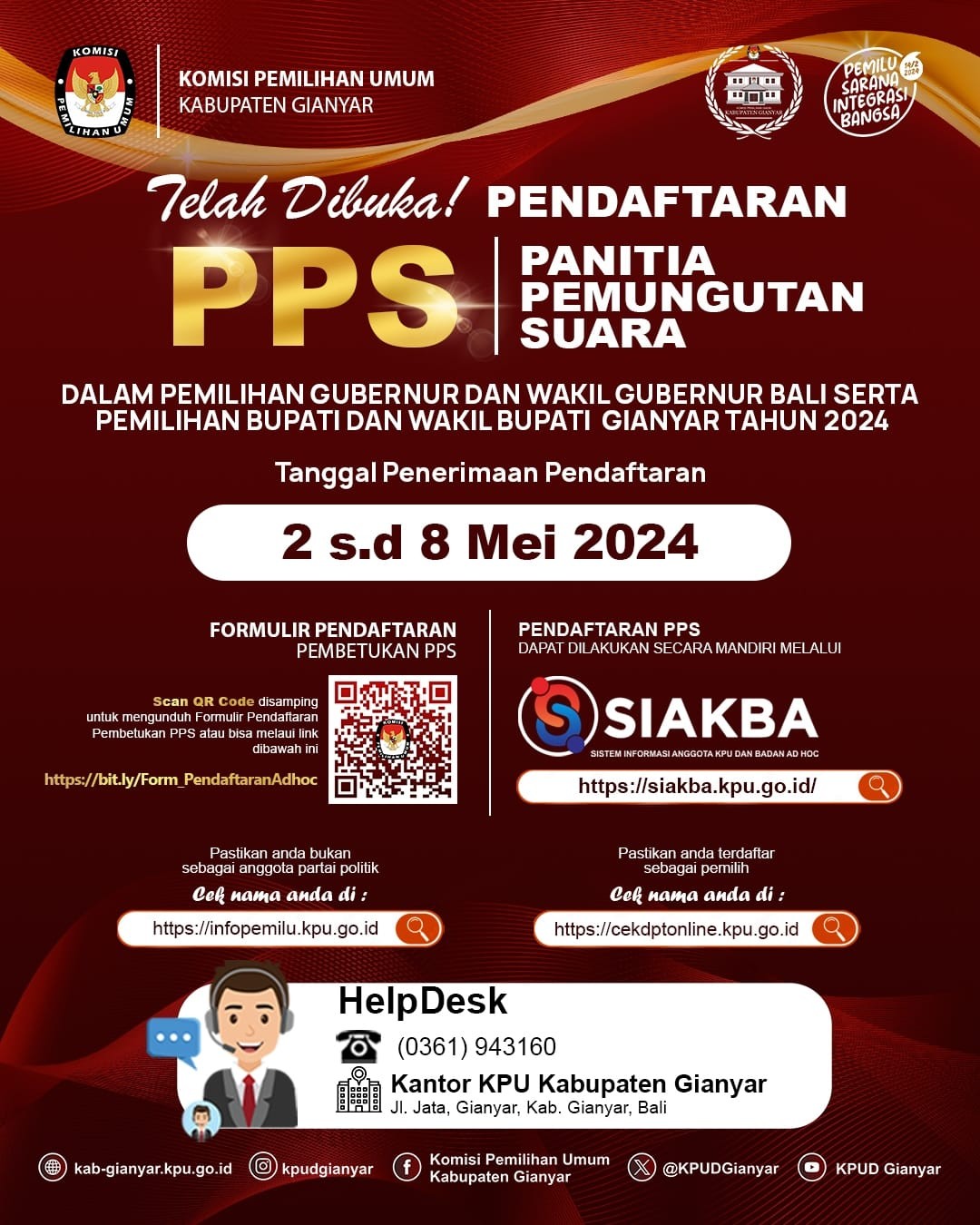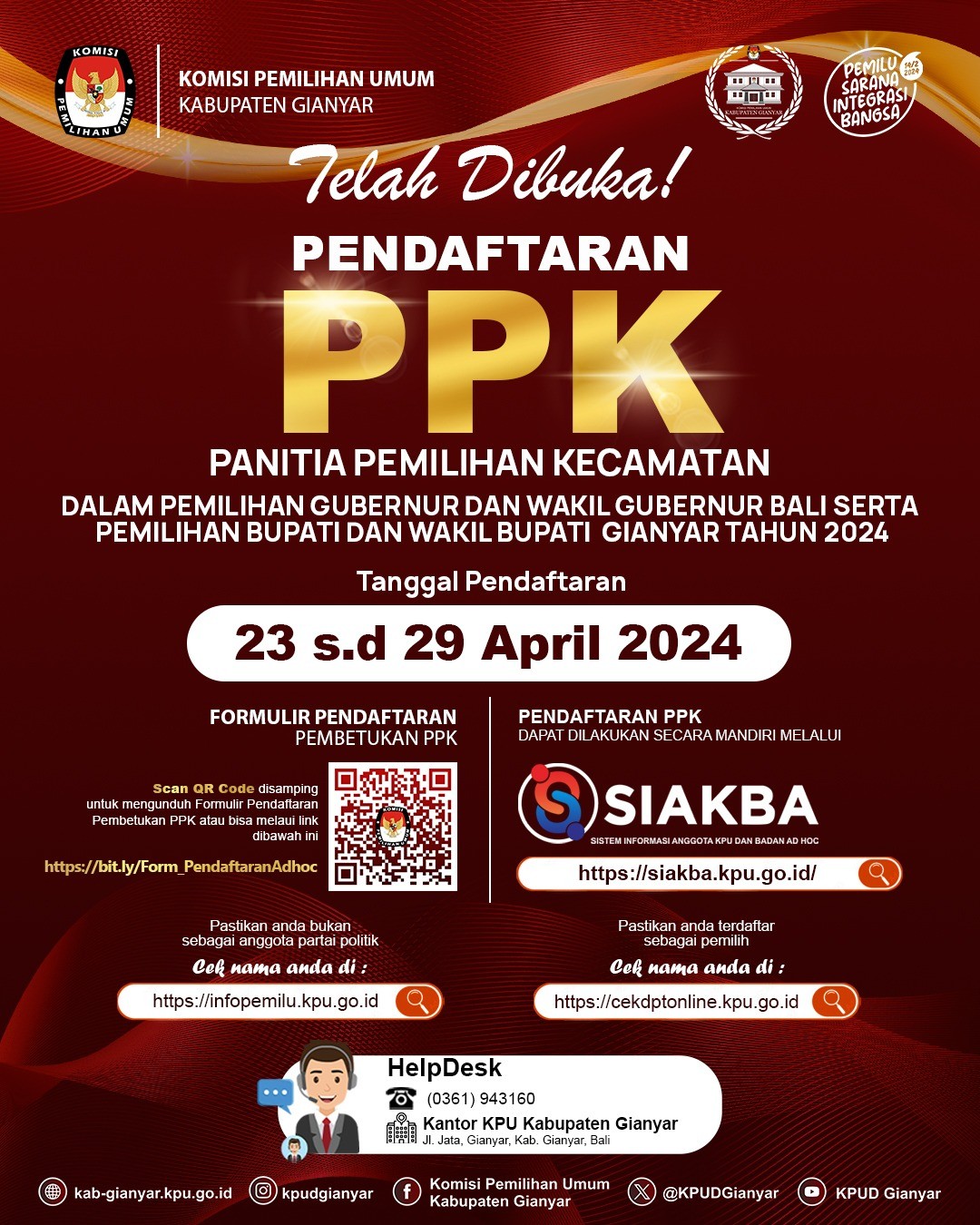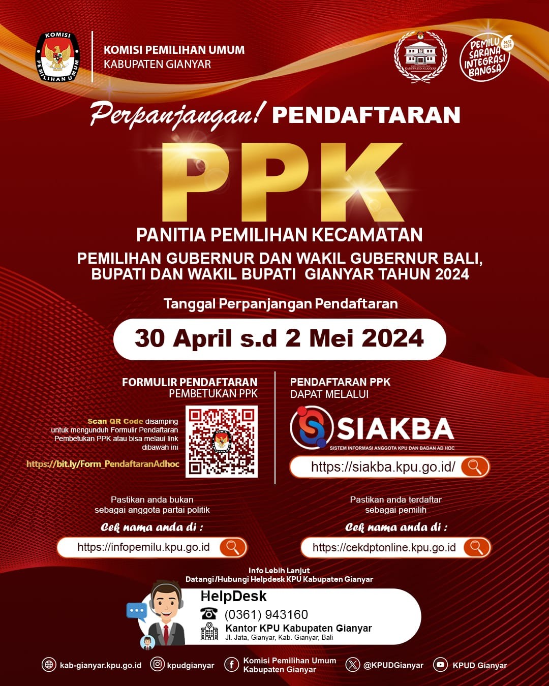 Hai #TemanPemilih KPU Kabupaten Gianyar, membuka perpanjangan waktu pendaftaran seleksi calon anggota PPK sejak tanggal 30 April 2024 sampai dengan tanggal 2 Mei 2024 pada kecamatan sebagai berikut :