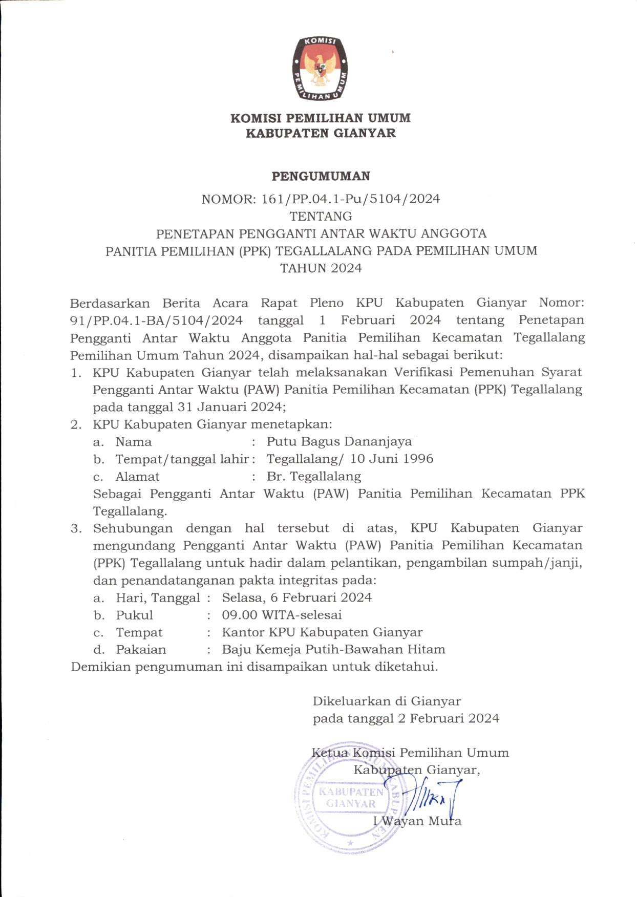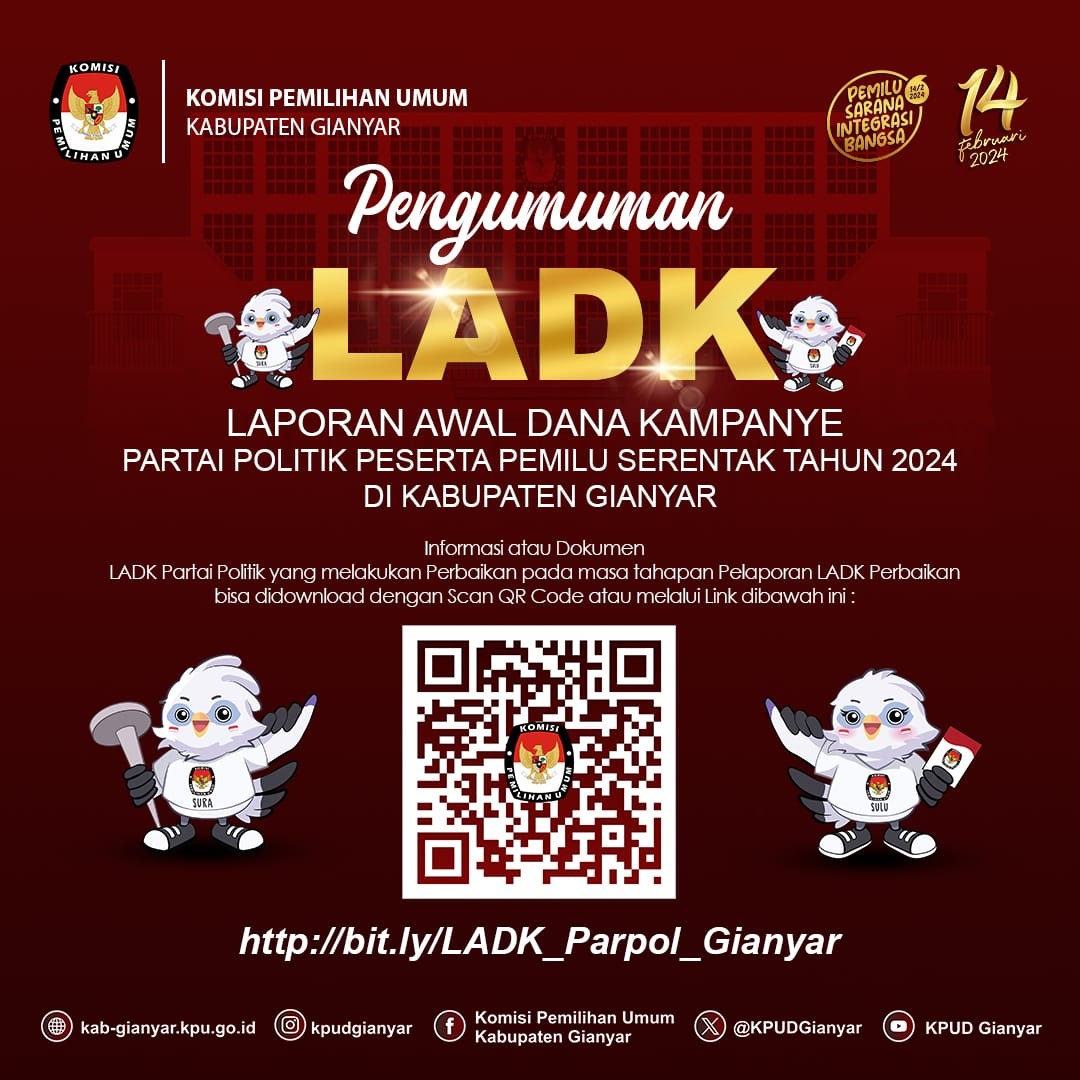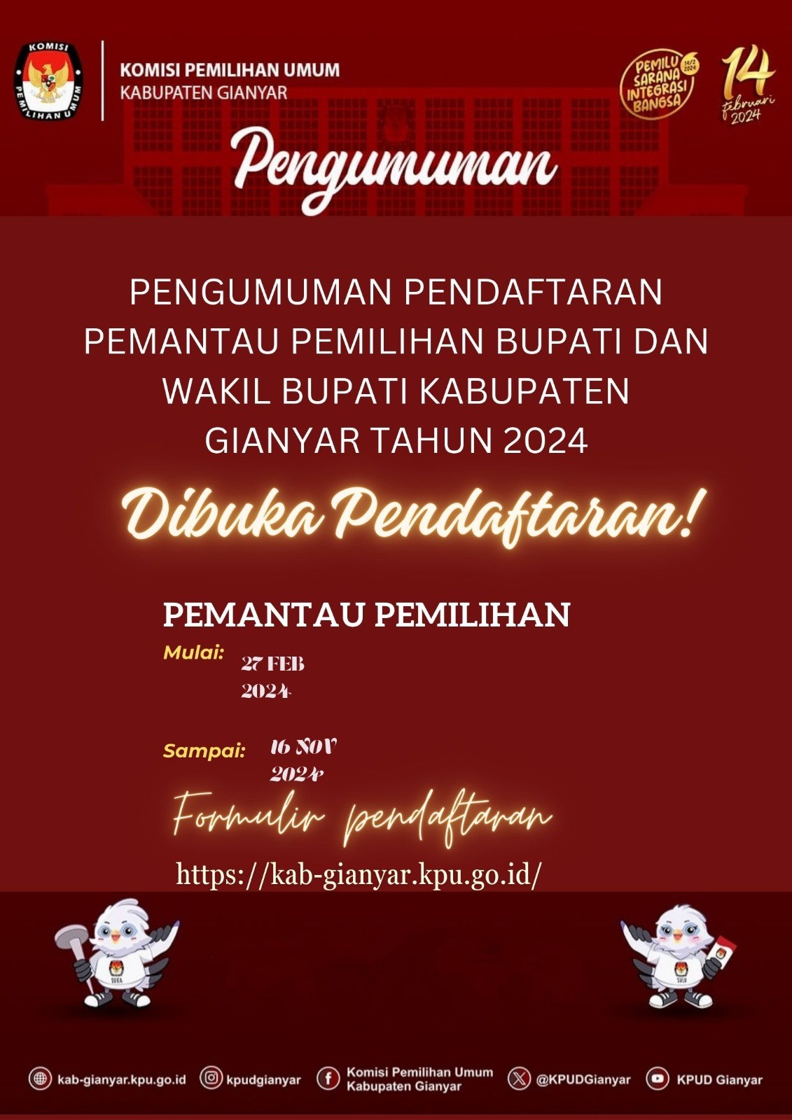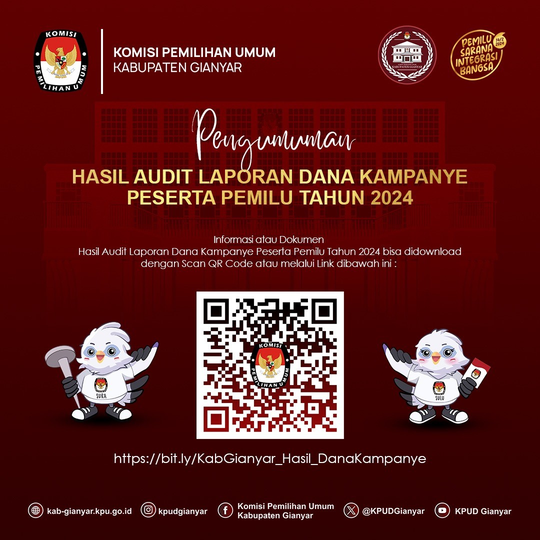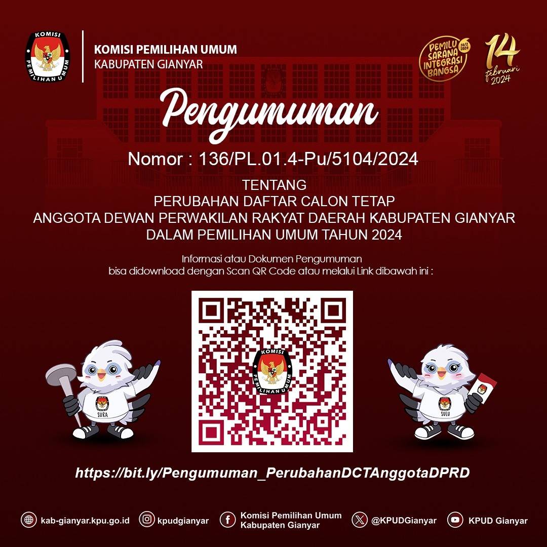 Dalam rangka melaksanakan Peraturan Komisi Pemilihan Umum Nomor 2 Tahun 2024 tentang Tahapan dan Jadwal Pemilihan Gubernur dan Wakil Gubernur, Bupati dan Wakil Bupati, serta Walikota dan Wakil Walikota Tahun 2024, Peraturan Komisi Pemilihan Umum Nomor 9 Tahun 2022 tentang Partisipasi Masyarakat Dalam Pemilihan Umum dan Pemilihan Gubernur dan Wakil Gubernur, Bupati dan Wakil Bupati, dan/atau Walikota dan Wakil Walikota, maka Komisi Pemilihan Umum Kabupaten Gianyar mengumumkan pendaftaran Pemantau Pemilihan Dalam Negeri.